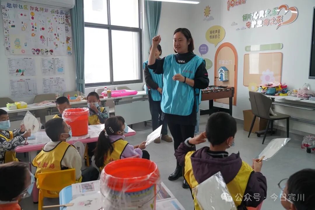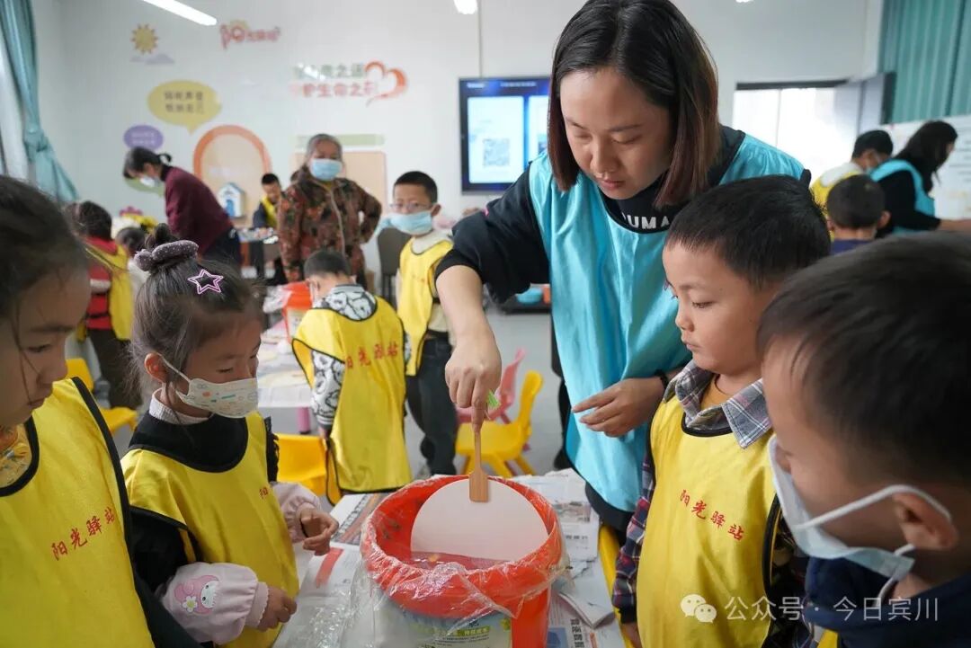 最令人期待的漆扇制作环节到来,小朋友们早已按捺不住好奇心,分组围坐在小课桌前,盯着桌上的扇子跃跃欲试。 小朋友们将不同颜色的漆滴入水中,任其自由扩散、交融, 再将扇面轻轻覆盖水面,一幅独一无二的肌理图案便自然形成。他们屏息凝视,像在观看一场微观的日出与云海。偶尔出现油漆覆盖不理想的“小插曲”,志愿者帮助孩子们吸去水桶中的油漆,引导孩子们重新滴入漆料,鼓励他们把“意外”变成“惊喜”。“做漆扇的过程就好像变魔术一样,每一次做出来的都不一样!”小朋友们惊叹道。这一刻,艺术不再遥远,传统不再抽象,文化的种子在快乐中生根发芽。