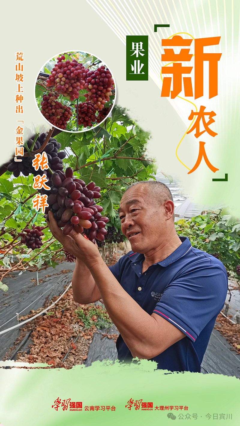 十年前,张跃祥在13亩荒坡播下葡萄试种的希望种子;如今,上千亩葡萄园丰产盈枝,他将宾川的荒山坡绘成了“金果园”,带着村民踏上葡萄致富的甜蜜征途。他用一把锄头、一颗较真的心,改写了土地“容颜”,点亮了乡村振兴的熠熠希望。