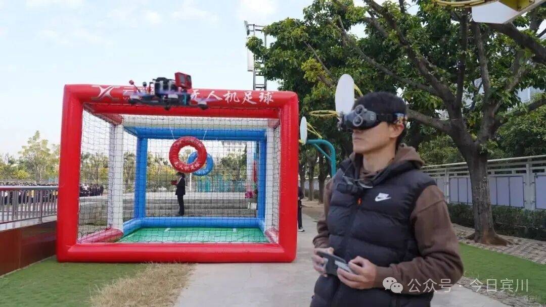 升旗仪式庄重举行后,活动迅速进入高潮,极具视觉冲击力的穿越机呼啸升空,在空中急速翻转,划出优美弧线,引来阵阵惊叹。随后的无人机足球表演更将科技与体育完美融合,小操作员们通过遥控在三维空间中展开“空中攻防”,完成一次次精彩的“科技射门”。