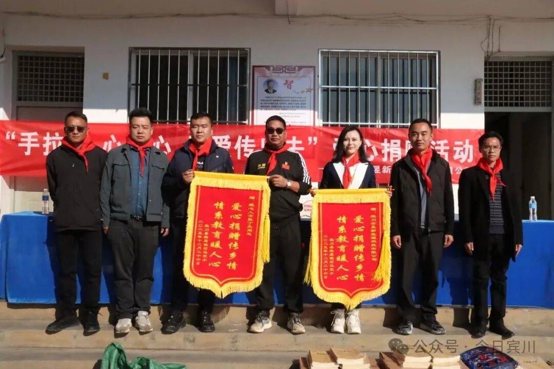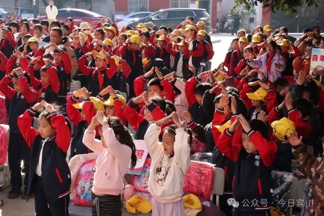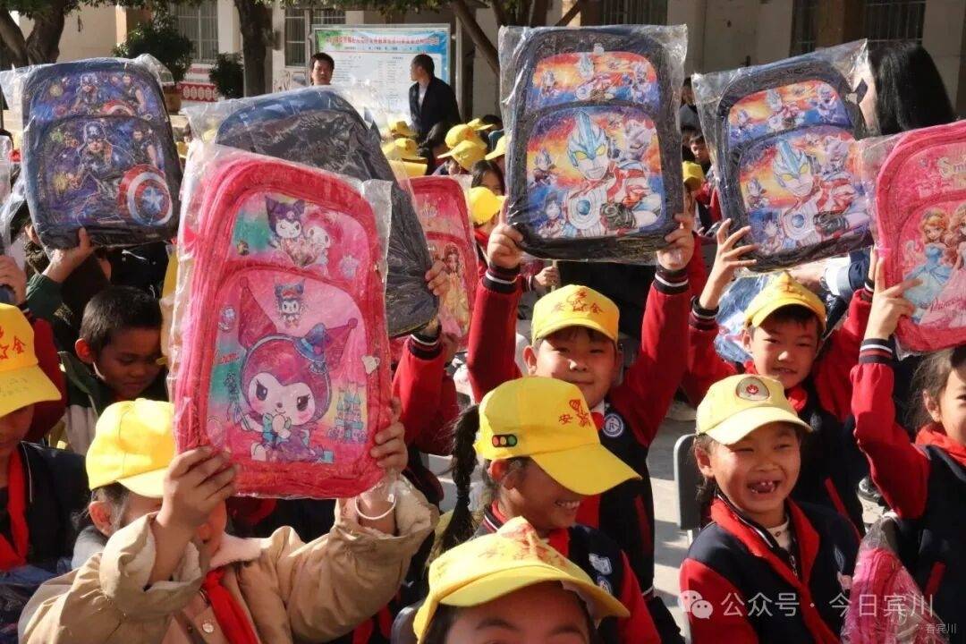 捐赠仪式上,石马完小六年级学生为爱心人士佩戴鲜艳红领巾,传递纯真谢意。孩子们接过崭新书包、作业本与学具,脸上洋溢灿烂笑容。