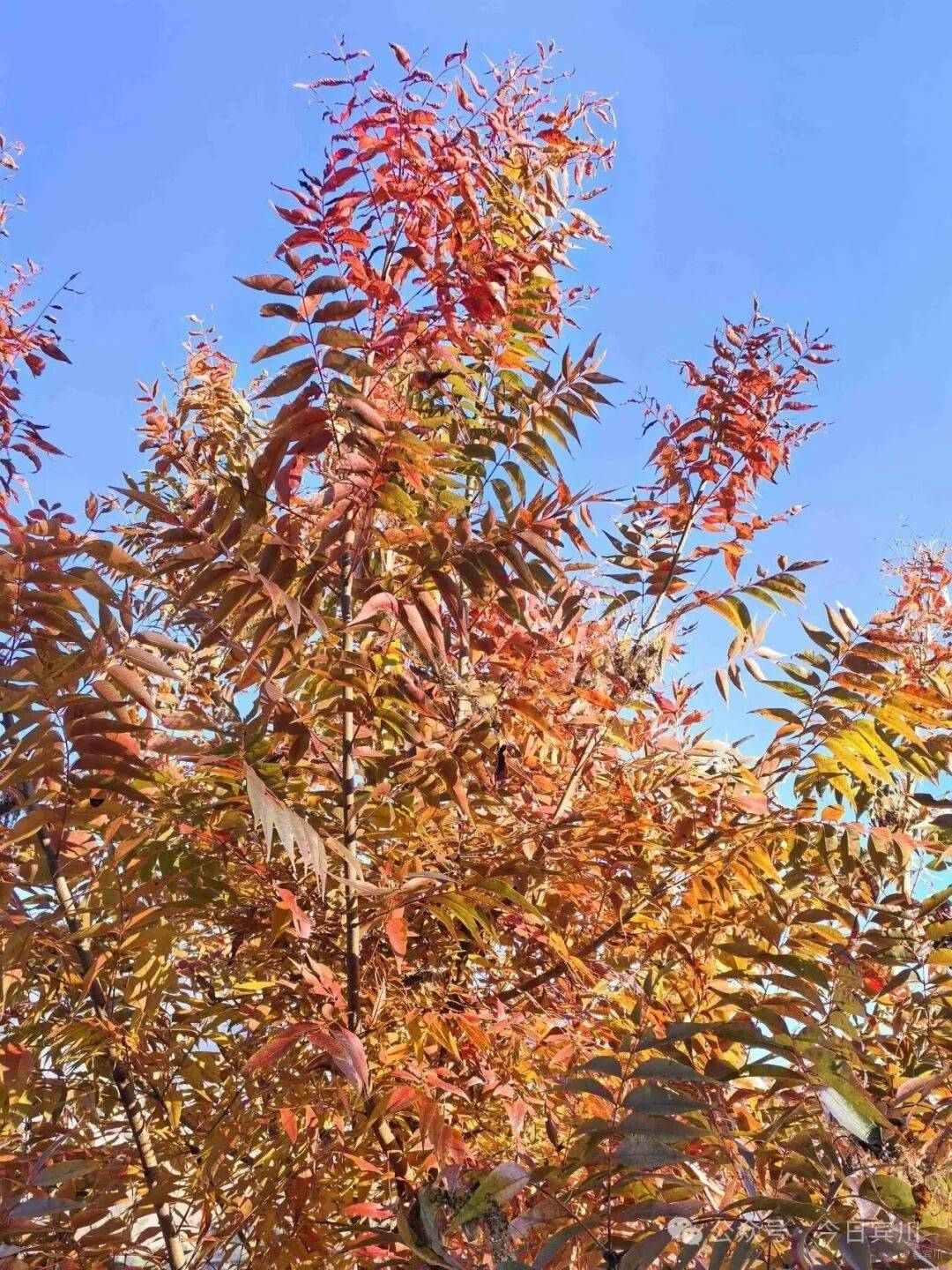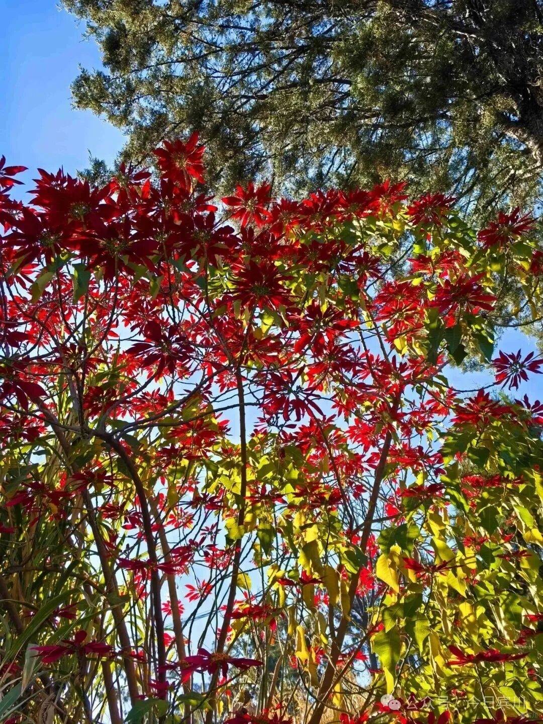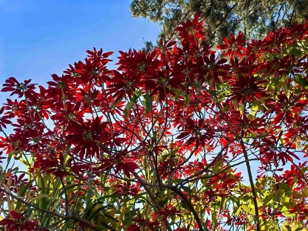 老黄连树的叶子向来含蓄,寻常冬日里,大多只是泛黄、微红,带着几分萧瑟。唯有在天气足够寒冷,且持续多日晴朗的年份,整棵树才会褪去所有内敛,绽放出极致的鲜红。今年的冬季格外寒冷,又恰逢连续十多天晴空万里,天时地利之下,才造就了这般“满树红叶燃霜天”的奇景。