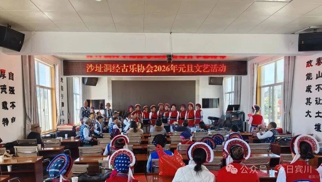 12月27日,宾川县鸡足山镇沙址村委会礼堂内丝竹悦耳、歌声悠扬,洋溢着喜庆祥和的新年气氛。鸡足山镇沙址洞经古乐协会在此举办2026年元旦文艺活动,以一场融汇传统古乐与时代旋律的文艺演出及深入恳谈,迎接新年的到来。