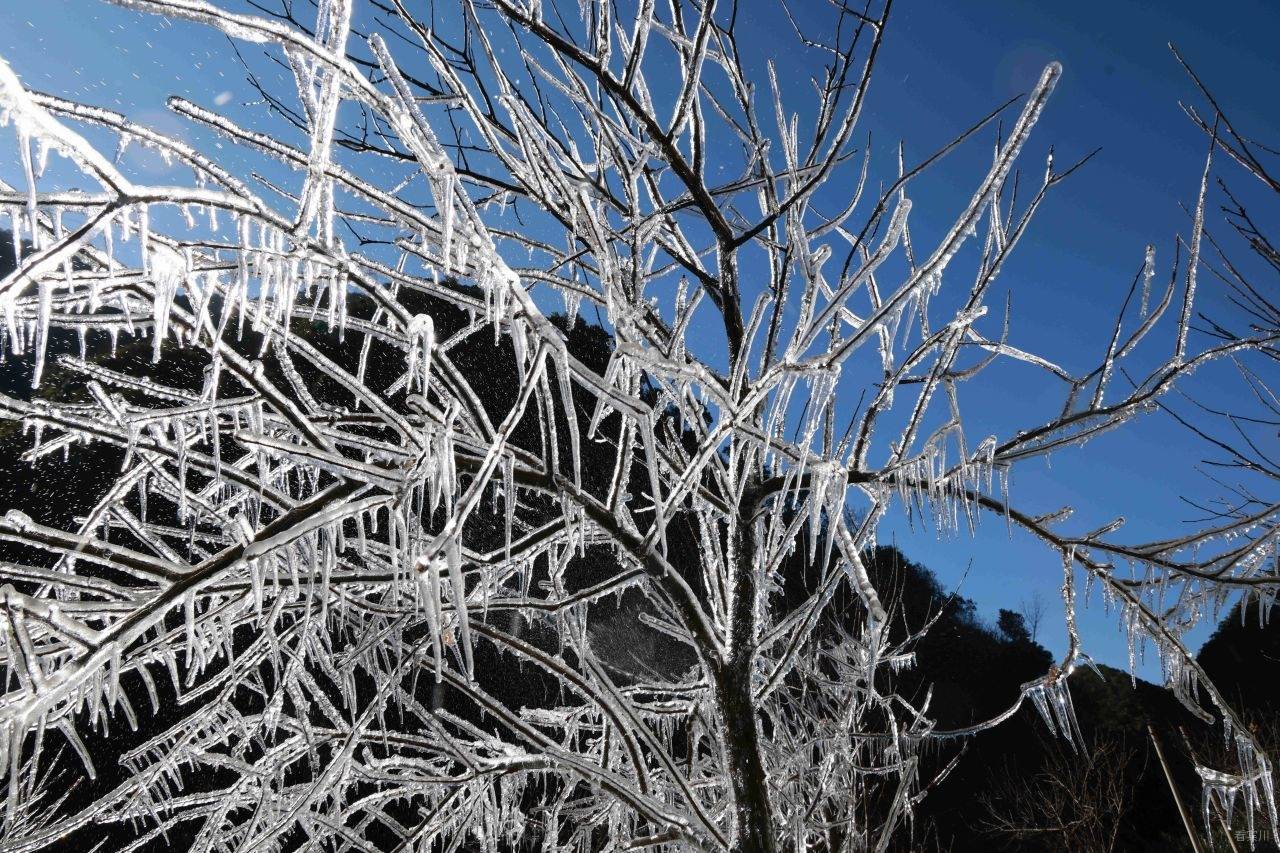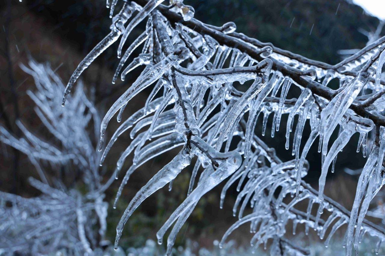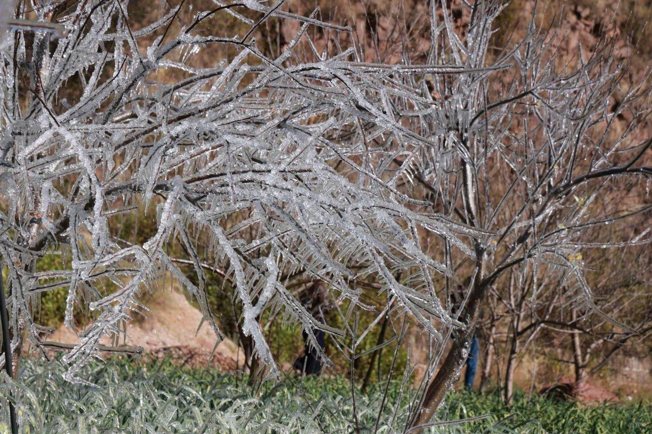 放眼望去,树枝白了,山坡白了,连呼出的气体都凝成了白雾,整座山坳仿佛一幅晶莹剔透的画卷。忽然想起明·杨慎《咏雾凇》中的诗句:“琼敷缀叶齐如剪,瑞树开花冷不香。”眼前的冰凌,恰似琼浆玉露镶嵌在枝桠间,又似瑞树上绽放的冰花,美丽得不染尘埃。