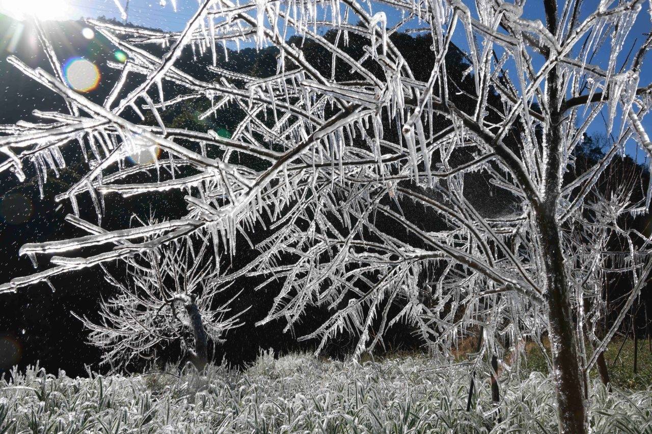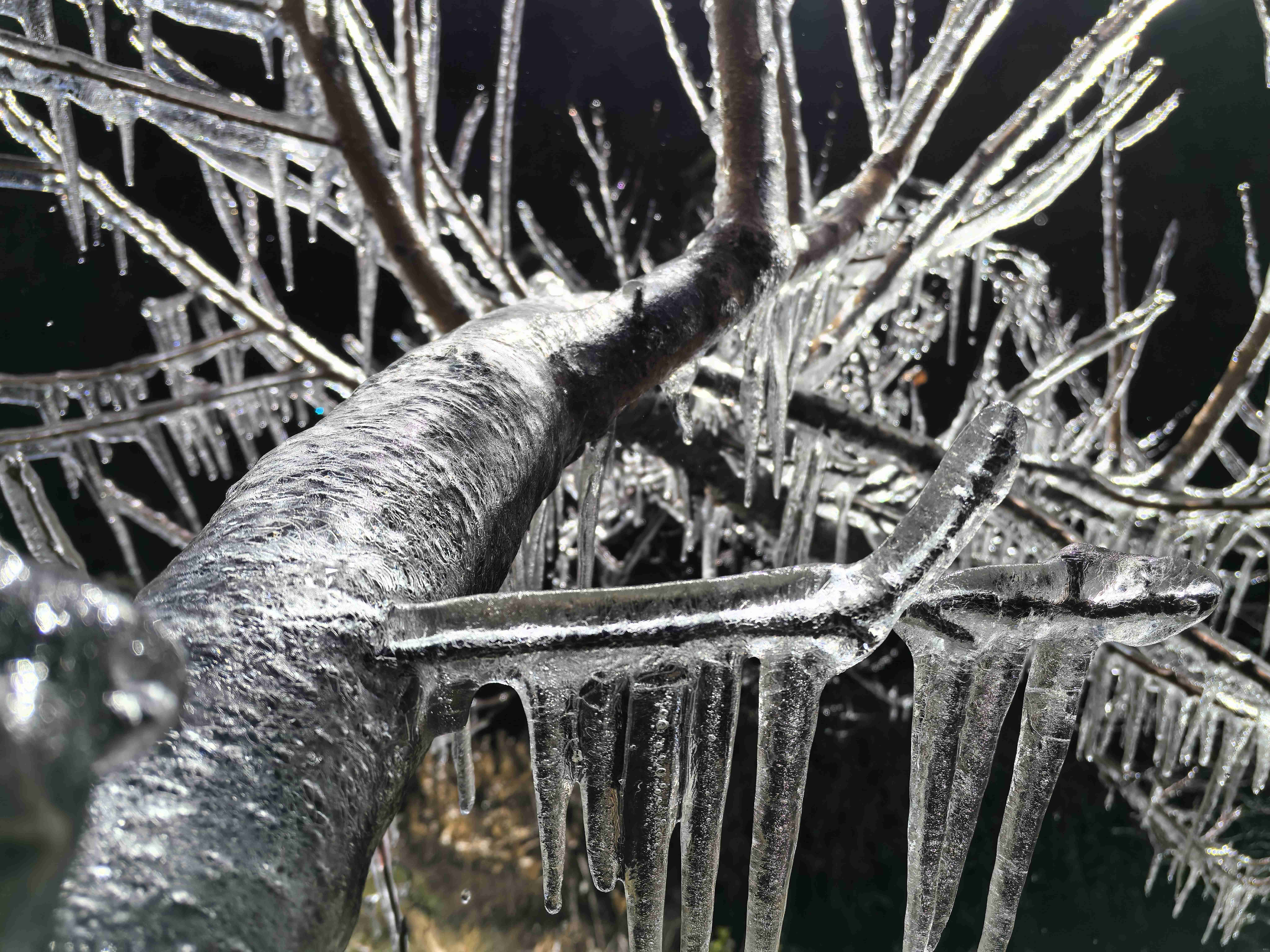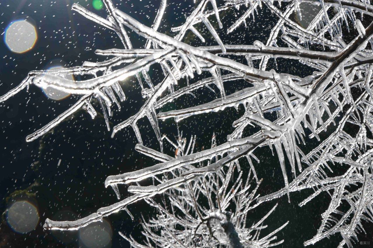 放眼望去,树枝白了,山坡白了,连呼出的气体都凝成了白雾,整座山坳仿佛一幅晶莹剔透的画卷。忽然想起明·杨慎《咏雾凇》中的诗句:“琼敷缀叶齐如剪,瑞树开花冷不香。”眼前的冰凌,恰似琼浆玉露镶嵌在枝桠间,又似瑞树上绽放的冰花,美丽得不染尘埃。