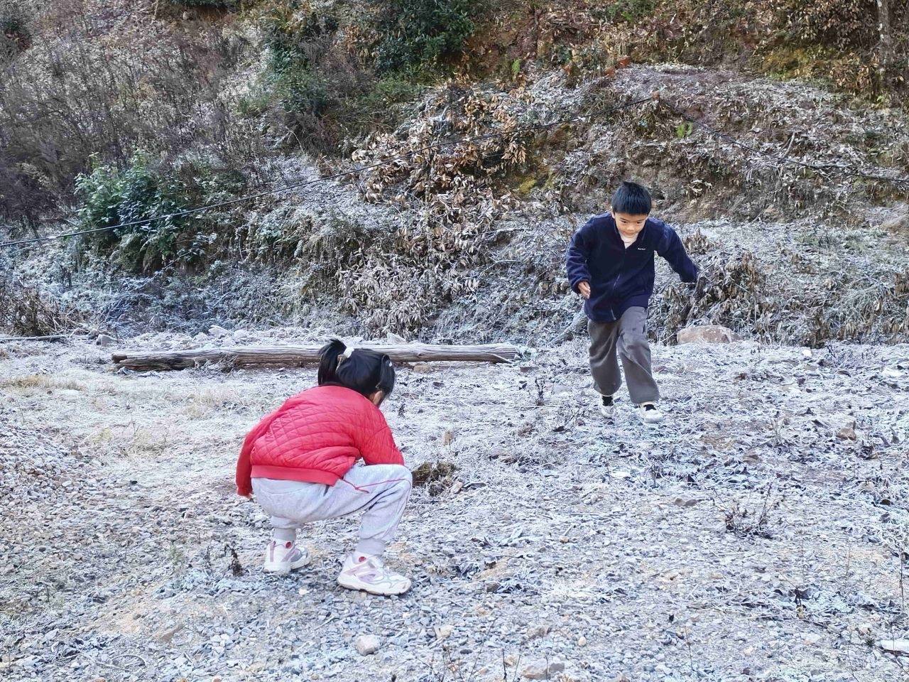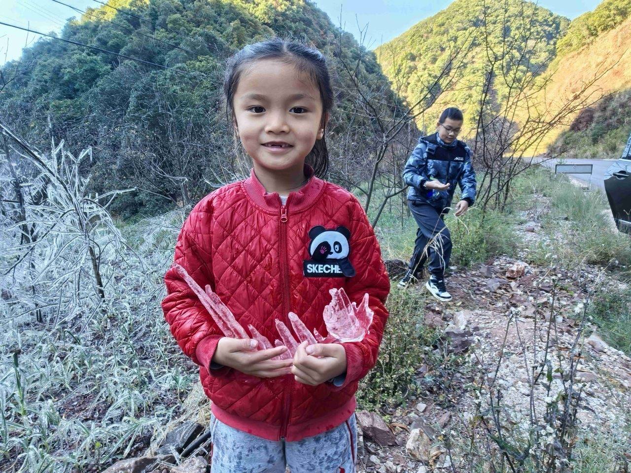 孙子的手冻得通红,身上冻得直打哆嗦,却依旧在冰凌间奔跑嬉戏,那份纯粹的快乐,与我儿时何其相似。这片山区的冰凌,虽不及北方雾凇那般壮阔,却藏着独有的冬日韵味,藏着两代人共有的童年欢喜。