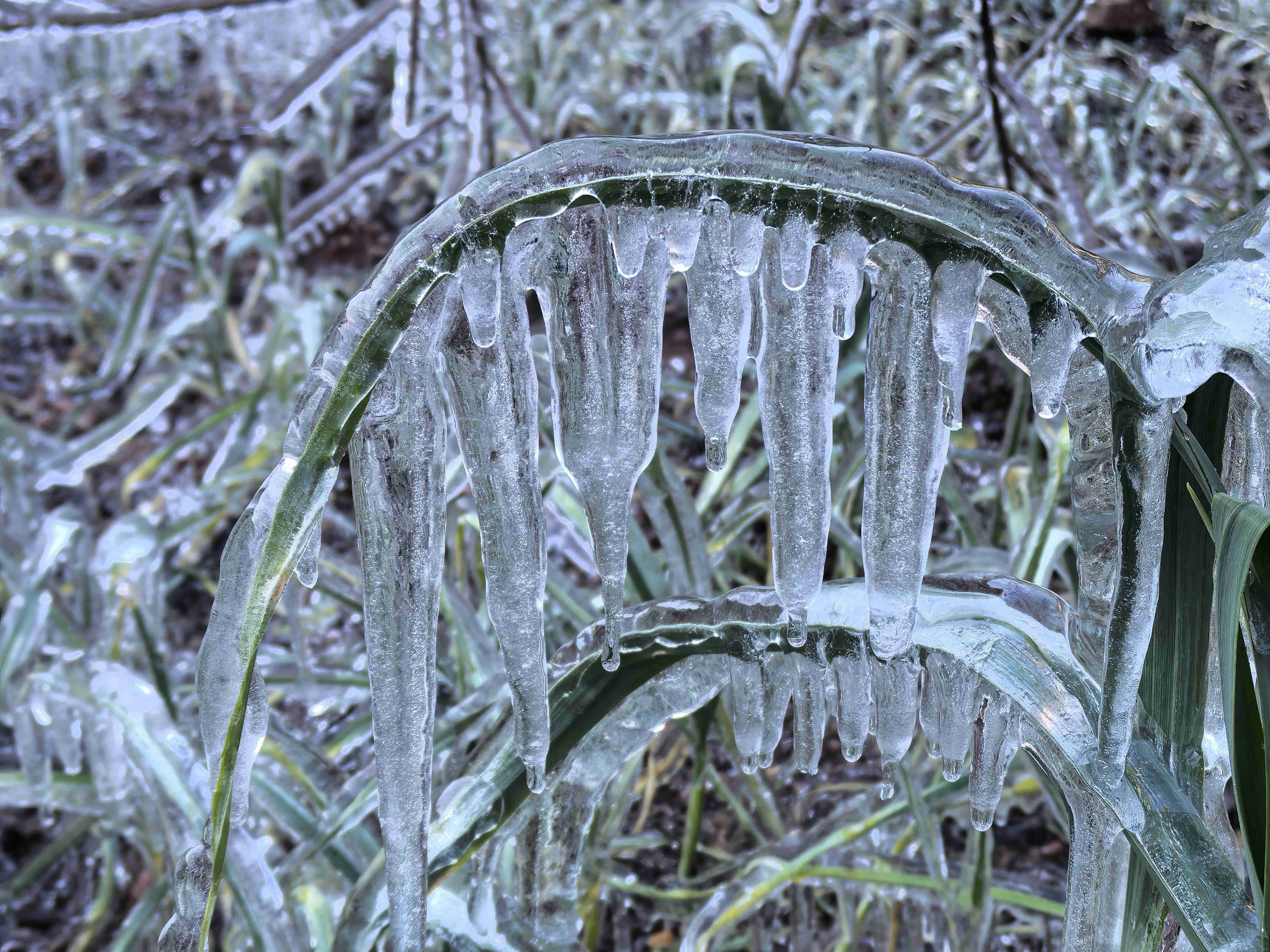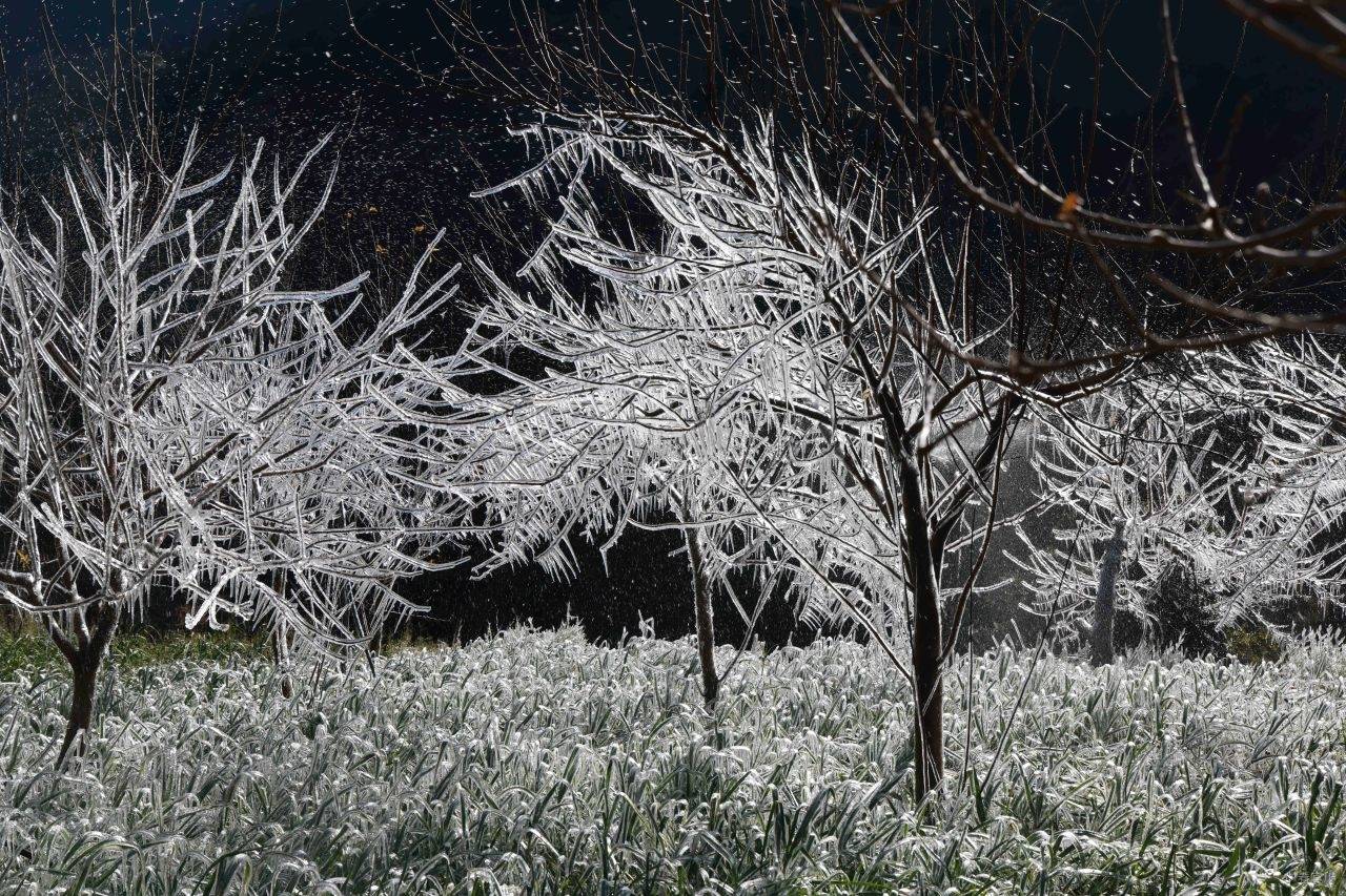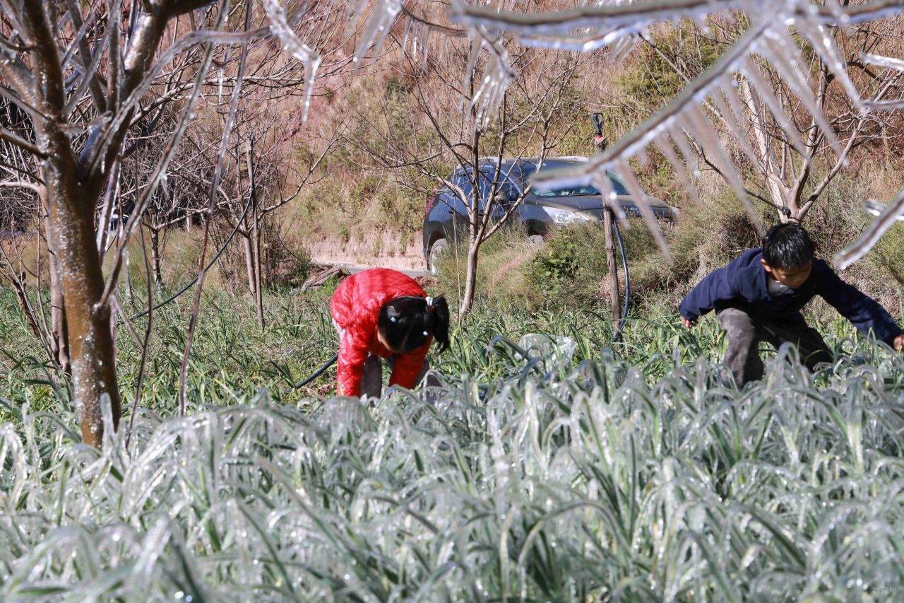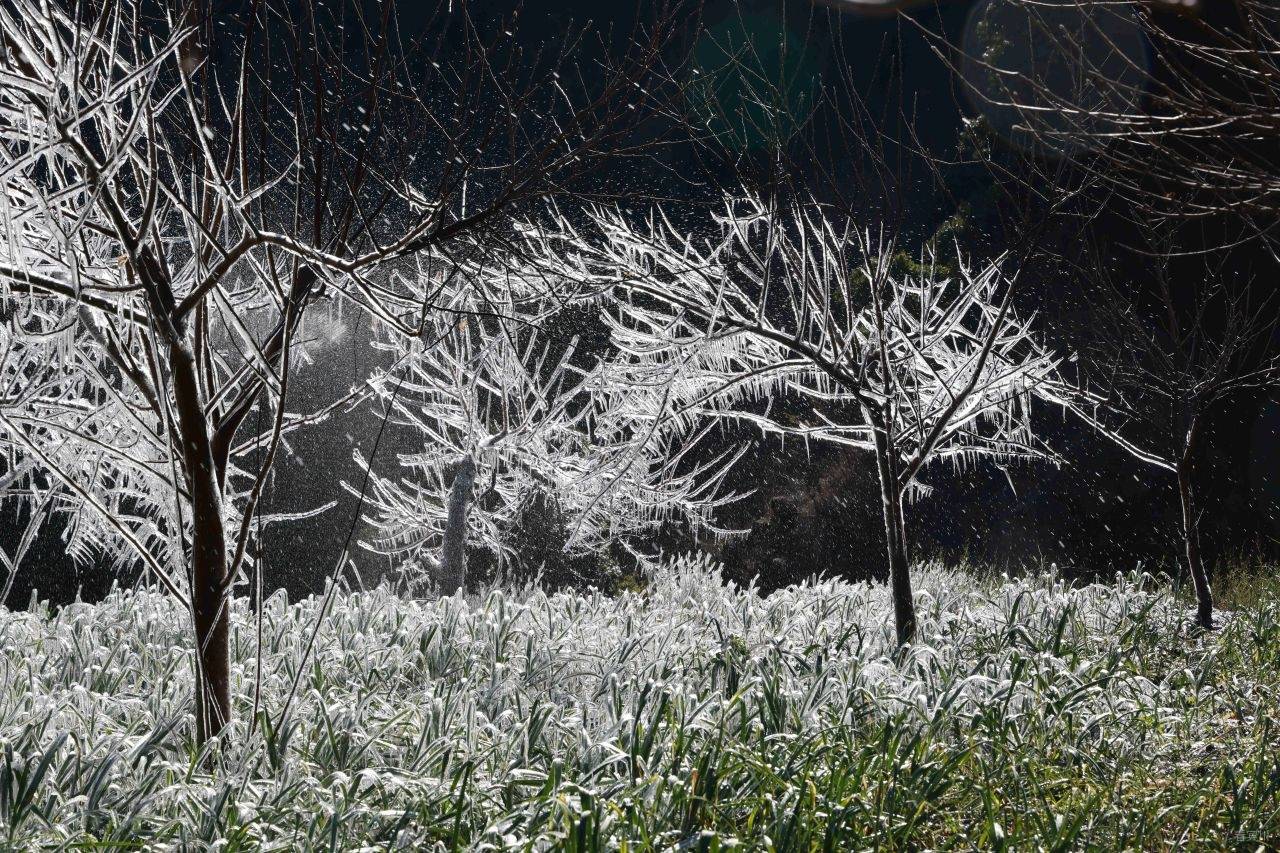 我慢慢走近,才看清这冰凌的由来——农户们为给果树和农作物灌溉,用塑料管引来山泉水喷灌,夜间气温骤降,喷出的泉水便在枝桠间、菜叶上凝结积累,长成了长短不一、奇形怪状的冰条,成了这片山坳里独有的人工景致。