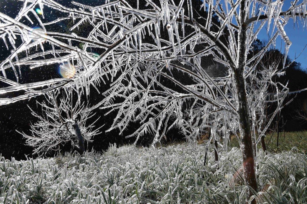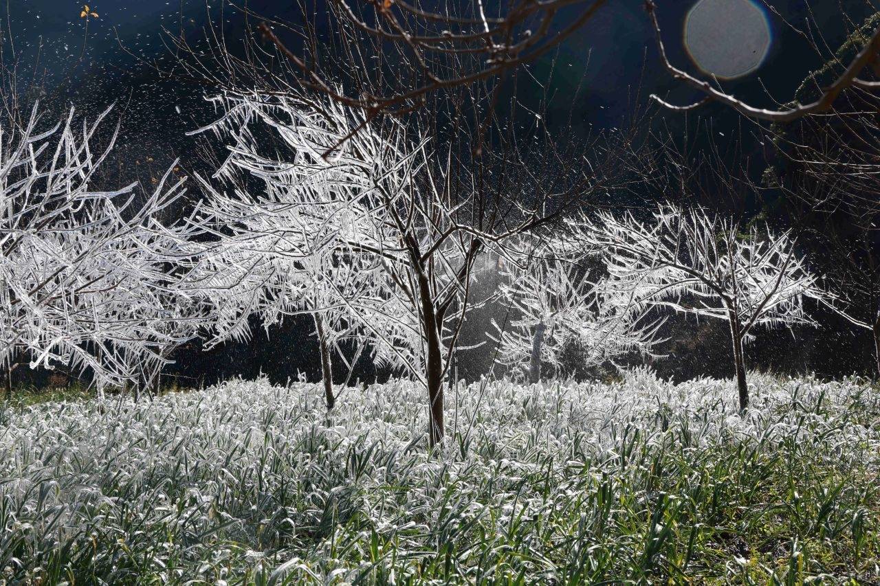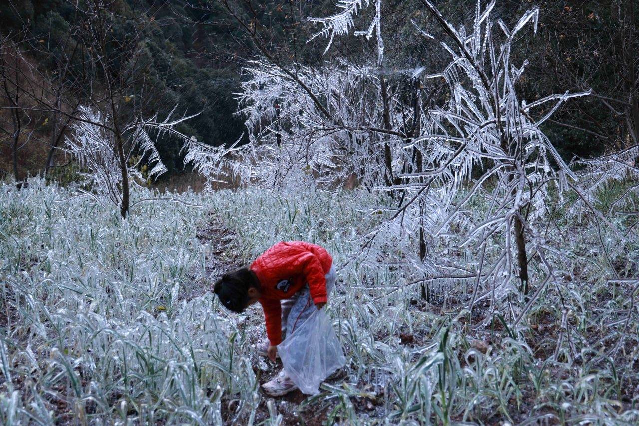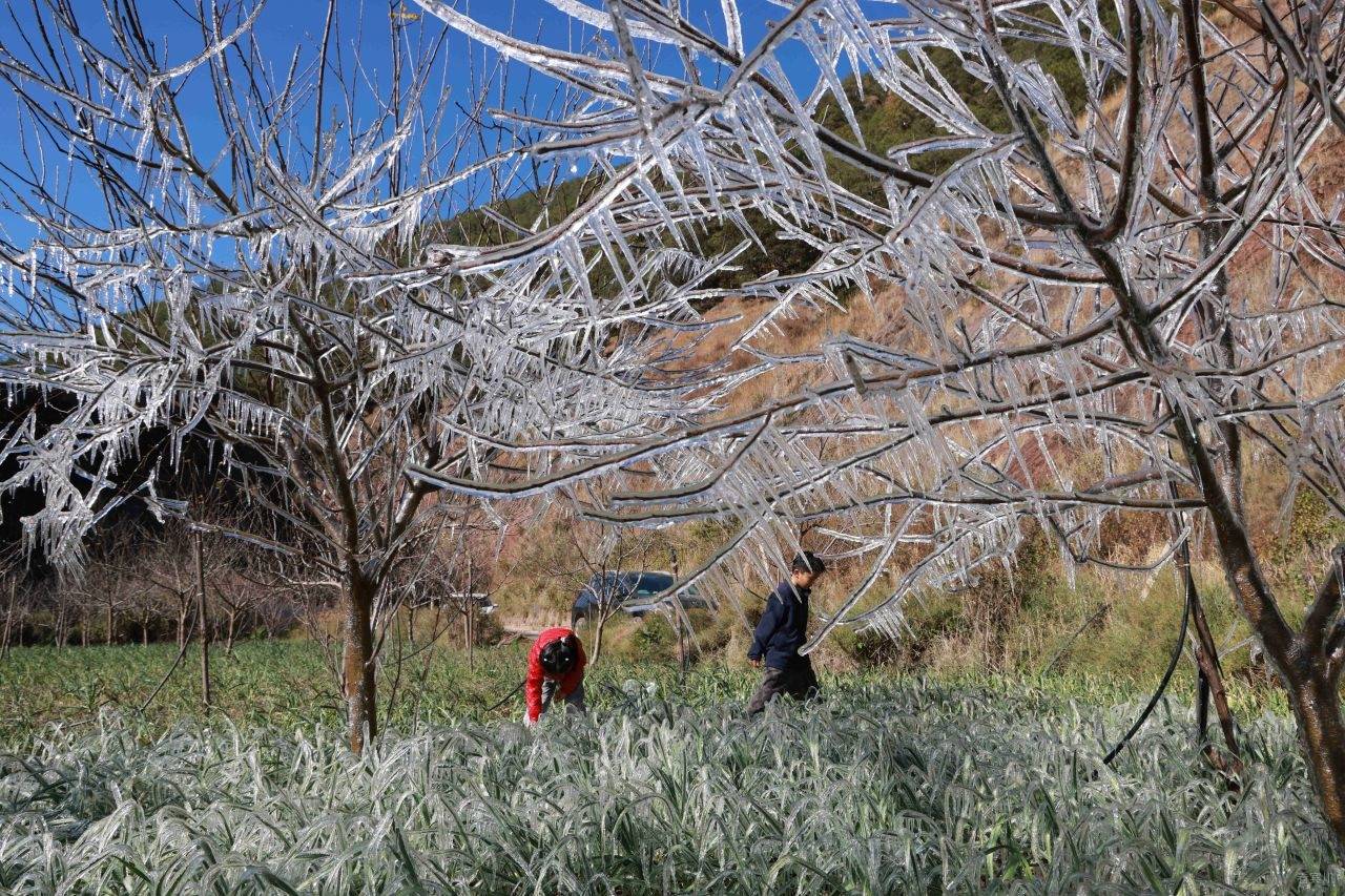 蒜苗翠绿的叶片被厚厚的冰壳包裹,像一片亮晶晶的迷你森林;落尽了叶子的苹果树枝,裹着通透的冰衣,在蓝天青山的映衬下,愈发显得晶莹剔透,一树树冰凌,宛如大自然精心雕琢的艺术品,美不胜收。