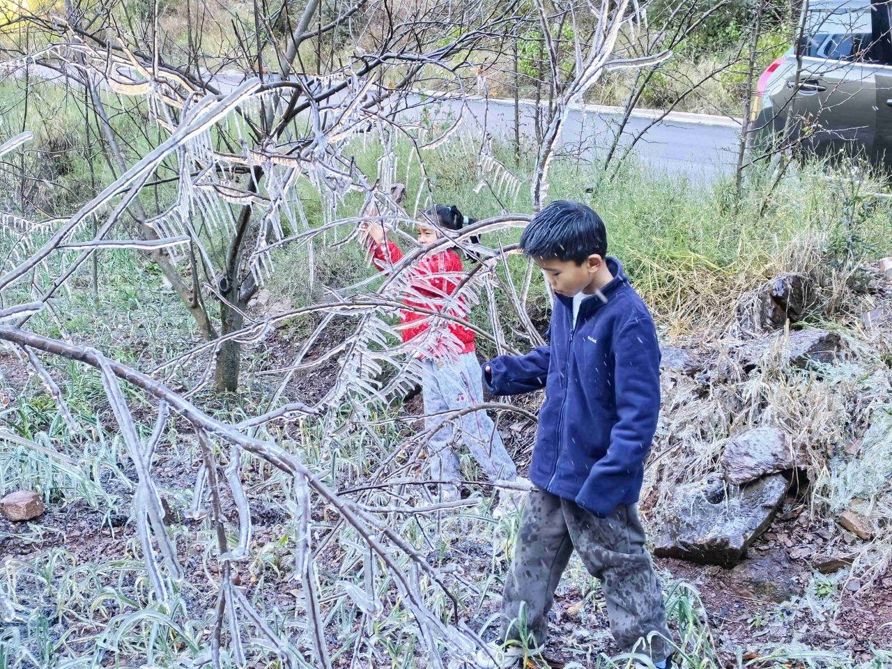 孩子们蹲下,指尖轻轻触碰枝桠上的霜花,细绒似的白霜沾在掌心,转瞬便化了,只留下一丝沁凉。小手冻得通红,他们却眉眼弯弯,叽叽喳喳地议论着这从未见过的景致。我望着他们雀跃的模样,轻声说:“前面还有更奇的,叫冰凌,你们准没见过。”听闻此言,两个小家伙立刻拽着我的衣角往车上跑,催着我快快赶路,好奇的心思早已飘向了前方。