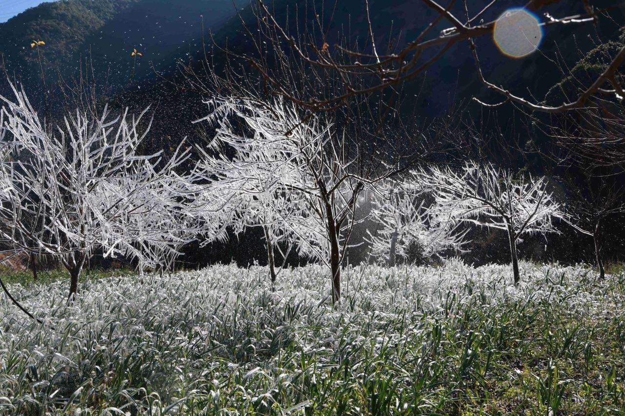 新年第一天,应老家亲友之邀,我们带着两个孙子返乡赴杀猪宴。车行至三十五里坡,翻过松坪哨垭口,便闯入了四十五里箐的怀抱。山高箐深,寒气骤然裹身,车窗外的山坡、水沟、果树间,尽数铺着一层白花花的霜,像撒了满地碎银。两个在干热河谷县城长大的孩子,扒着车窗惊呼:“下雪了!下雪了!”我笑着停下车,拉他们走到山箐边:“这是霜,比雪更细,也更凉呢。”