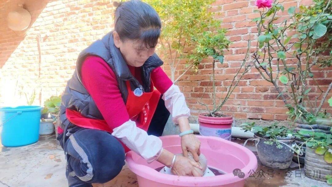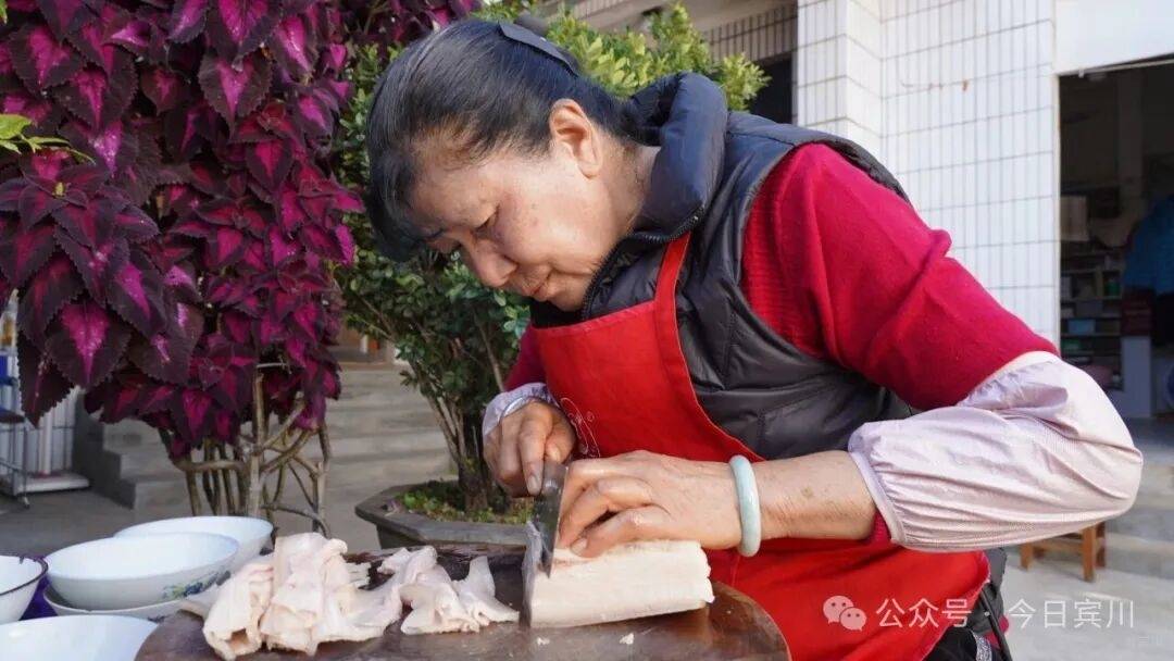 “宾居的夹沙肉,是我们几十年的老传统。”张大妈一边清洗五花肉,一边说道,“我年轻时候就跟着学做,现在老了,孙姑娘、儿子媳妇都爱吃,逢年过节就做给他们吃。平常做豆沙麻烦,我就提前煮好存着,他们想吃了随时能做。”在她眼里,这门手艺握在手里,做给家人吃就不叫麻烦。