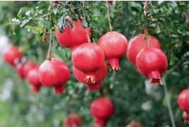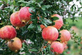突尼斯软籽石榴:果实近圆球形,微显棱肋,果整齐,平均单果重 406 克。成熟后外围向阳处果实全红,间有浓红断续条纹。果皮光洁明亮,果皮薄呈黄红色,籽粒红色,可溶性固形物 15%,风味甜,品质优,成熟早,成熟上市期 9-10 月。籽粒比较软,易下咽,不足之处是贮藏期较短。