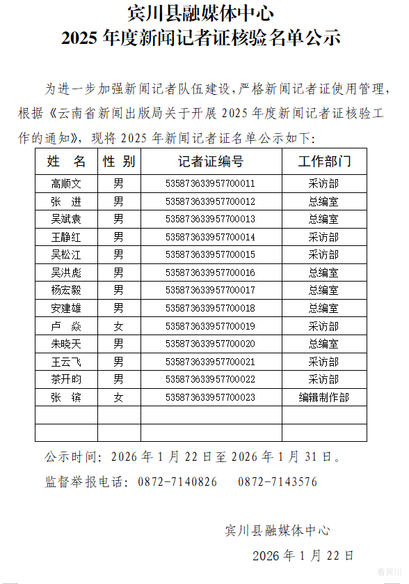 宾川县融媒体中心2025年度新闻记者证核验名单公示