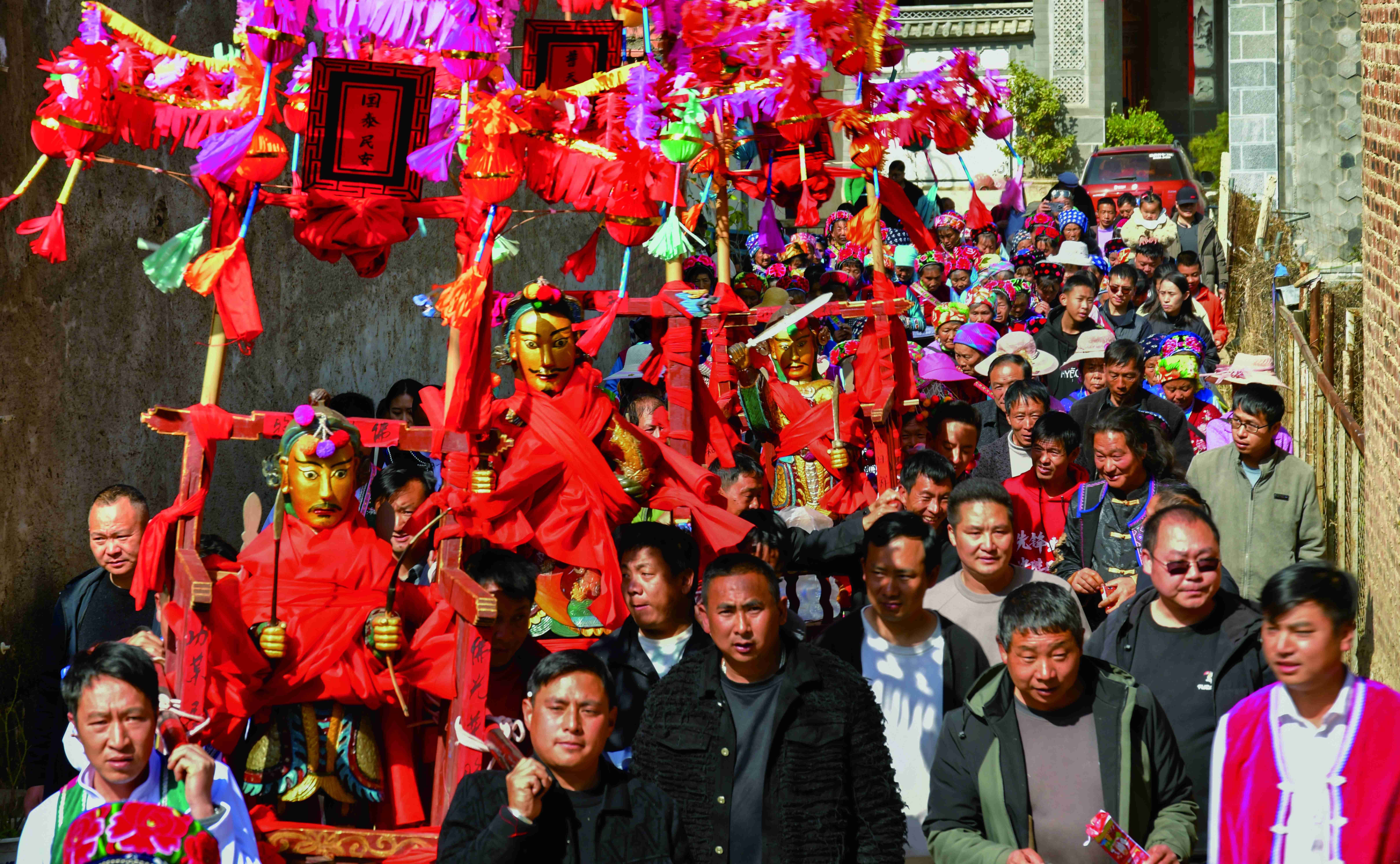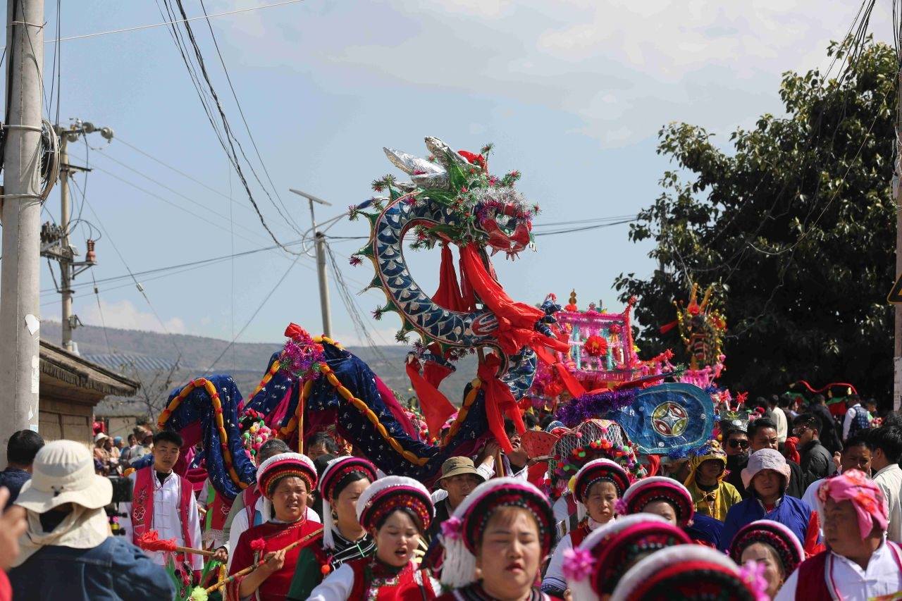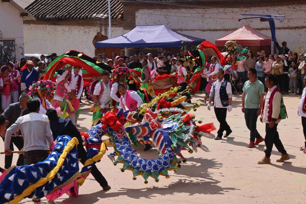 抵达文庙后,各龙狮表演队纷纷亮出看家本领,在龙珠引领下,五龙龙腾虎跃、争先恐后,时而如猛虎下山,吼声震天;时而如蛟龙出海,勇猛向前。一旁的姑娘们身着艳丽白族服饰,随优美节拍打起霸王鞭,腾挪翻转间令人眼花缭乱,与龙队表演相映成趣,让游客近距离领略萂村民俗风情的无限魅力。朝拜礼仪结束后,小伙子们争先恐后将“神尊”塑像按座次捧入龙车与佛轿,龙队再度领衔,裹挟着狂欢浪潮踏上回程。