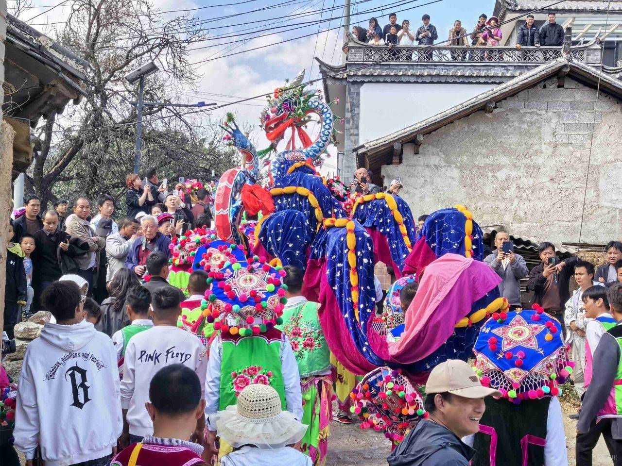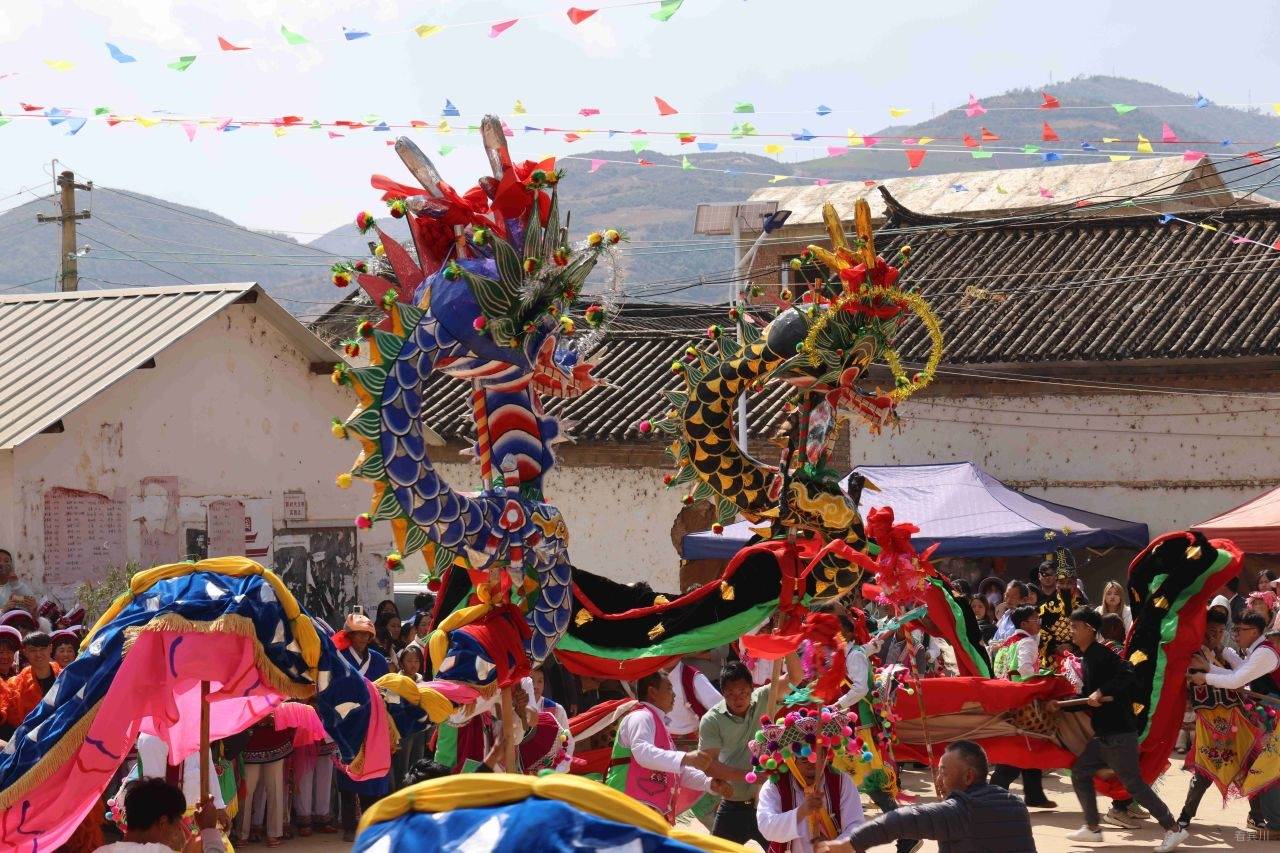 清晨时分,萂头村男女老少身着白族传统节日盛装,早早聚集在财神殿广场,静待恭迎“天子”回坛的庄严时刻。在开路先锋官、财神爷的引导下,五色神龙——青龙、黑龙、白龙、黄龙、赤龙昂首领衔,龙狮队紧随其后,接“天子”队伍载歌载舞、浩浩荡荡向天子行宫萂中文庙进发。在这条连接神圣与凡俗的仪典之路上,五龙腾跃,成为最耀眼的信仰图腾与力量象征,它们并非凡俗之舞,而是承载着千年祈愿的圣灵化身。