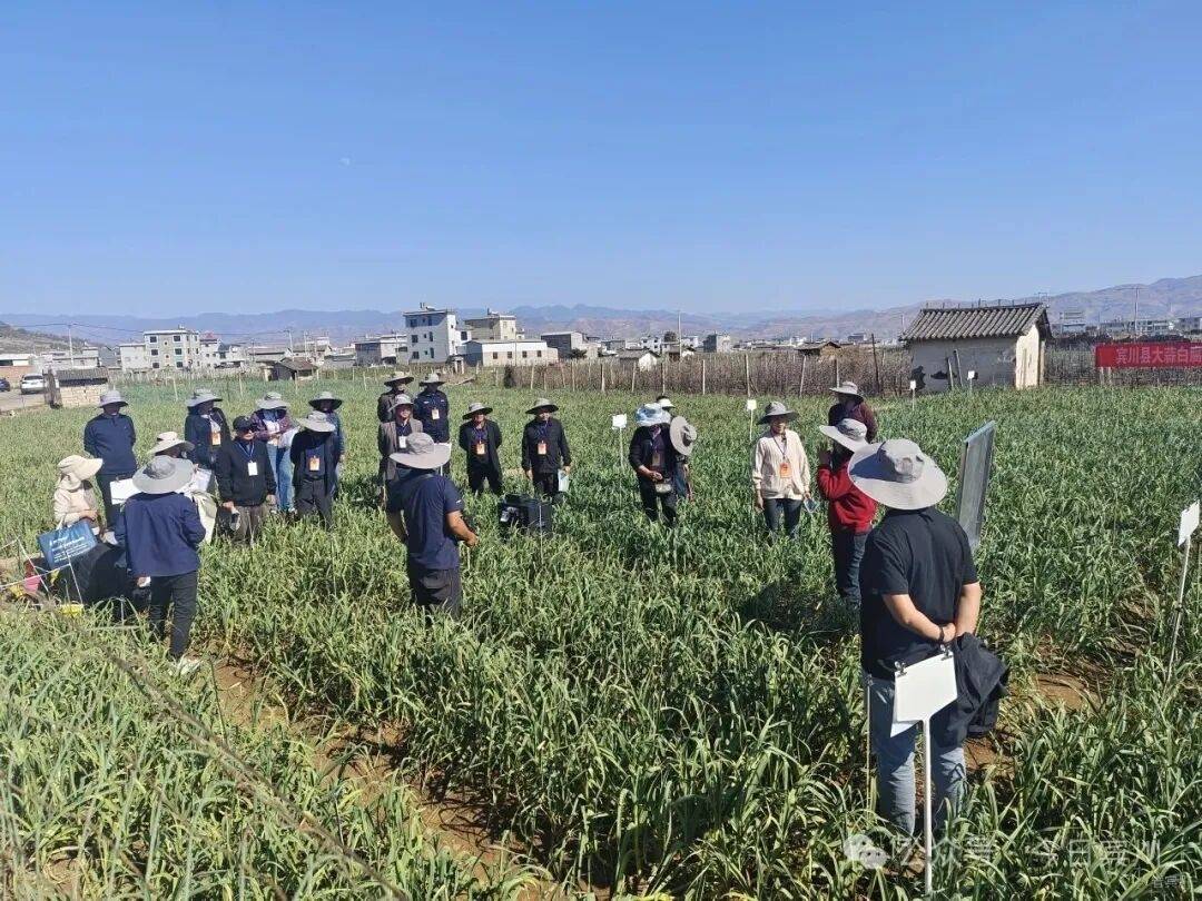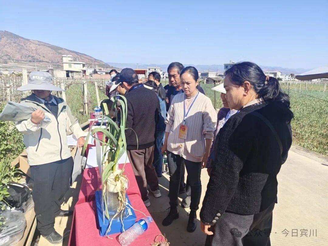 随后,代表们前往杨官村大蒜白腐病药剂防治试验田开展实地视察。该试验是由州县人大代表、县农技推广研究员何建群牵头,宾川县农业绿色发展服务中心与宾居镇综合保障与技术服务中心联合开展的。在试验田间,代表们首先详细了解了大蒜白腐病的病害特征、危害情况及防治重要性。随后,何建群老师向代表们系统讲解了本次试验采用的“拌种+喷淋”综合防治模式,并对比展示了试验田与未防治对照田的大蒜长势差异。代表们就药剂成本、施药周期、环境影响等问题与农技人员展开深入交流,表示此类试验紧密结合生产实际,方案科学合理,对保障大蒜产量与品质、促进农民增收具有重要意义;建议加强试验数据跟踪分析,及时总结最佳防治方案并向农户推广,同时探索生物防治与化学防治相结合的绿色防控技术,为大蒜产业持续健康发展提供坚实保障。
