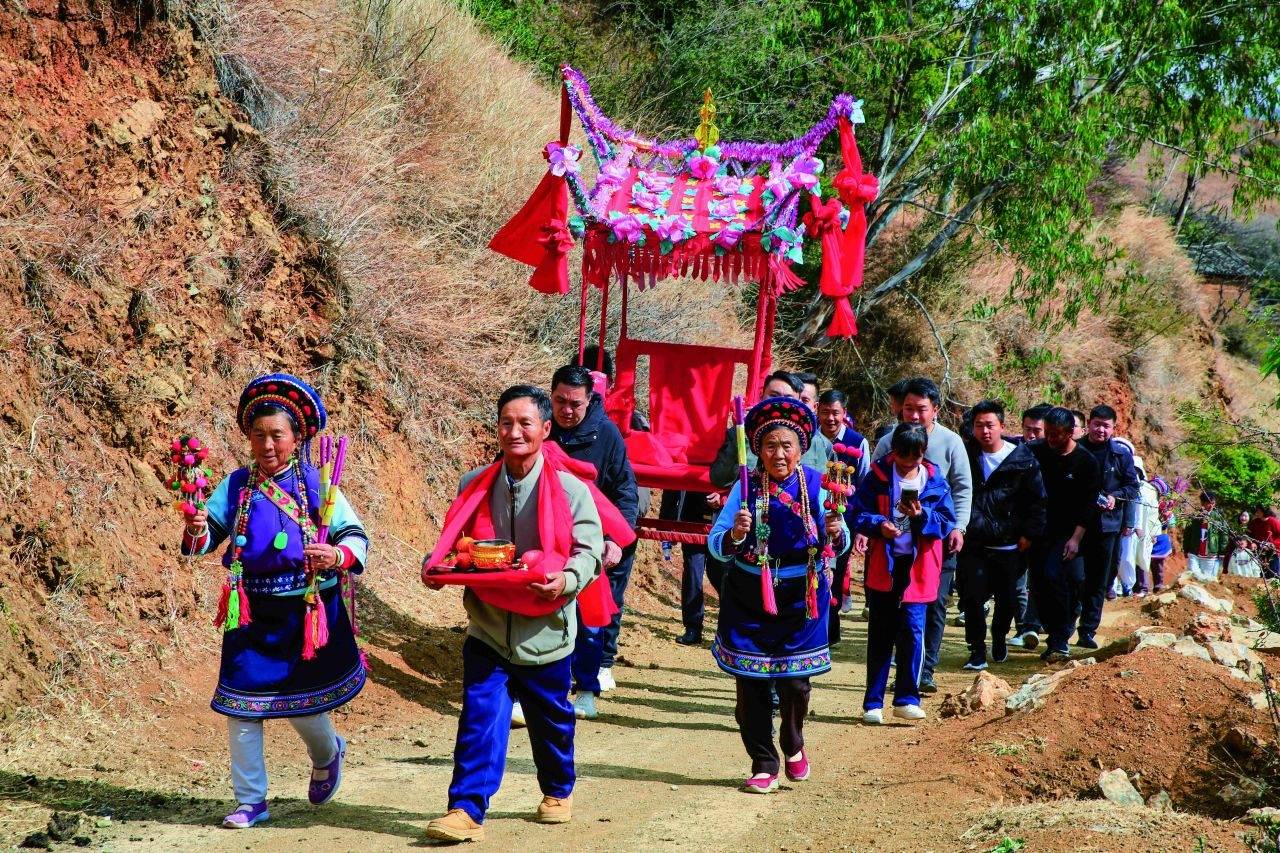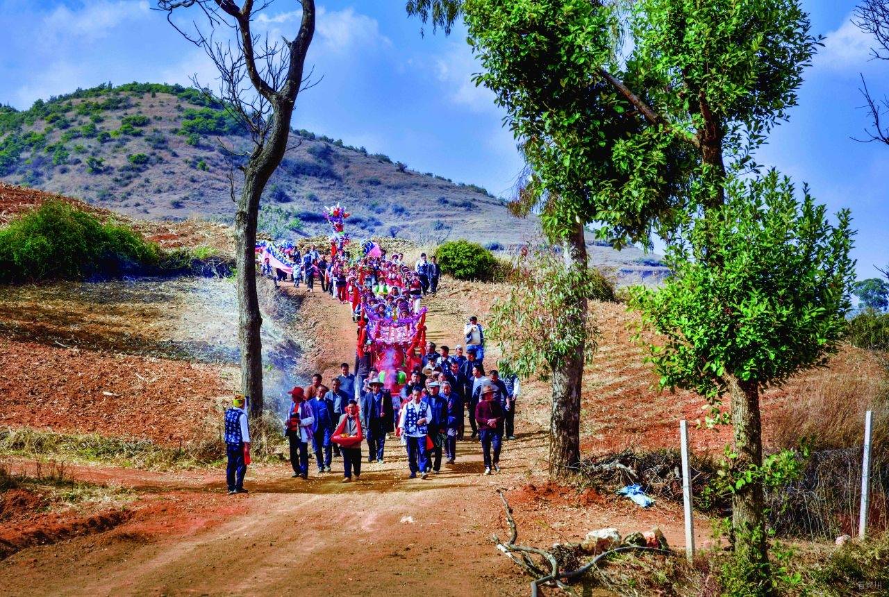 萂村“天子节”接本主活动,始于坝子尾的黑家邑。大年初二午后,村中男女老少换上簇新衣裳,手持高香,随莲池会、圣谕坛肃穆的队伍,分两路向老太箐与温水箐迤逦前行。舞龙耍狮的队伍开路,敲锣打鼓的节奏震天,村民们怀着虔诚之心,接引大老太、二老太归村安座。抵达目的地后,大家纷纷敬香供食,感念神明庇佑,这场虔诚的奉祀,要持续至正月初六送神之时。