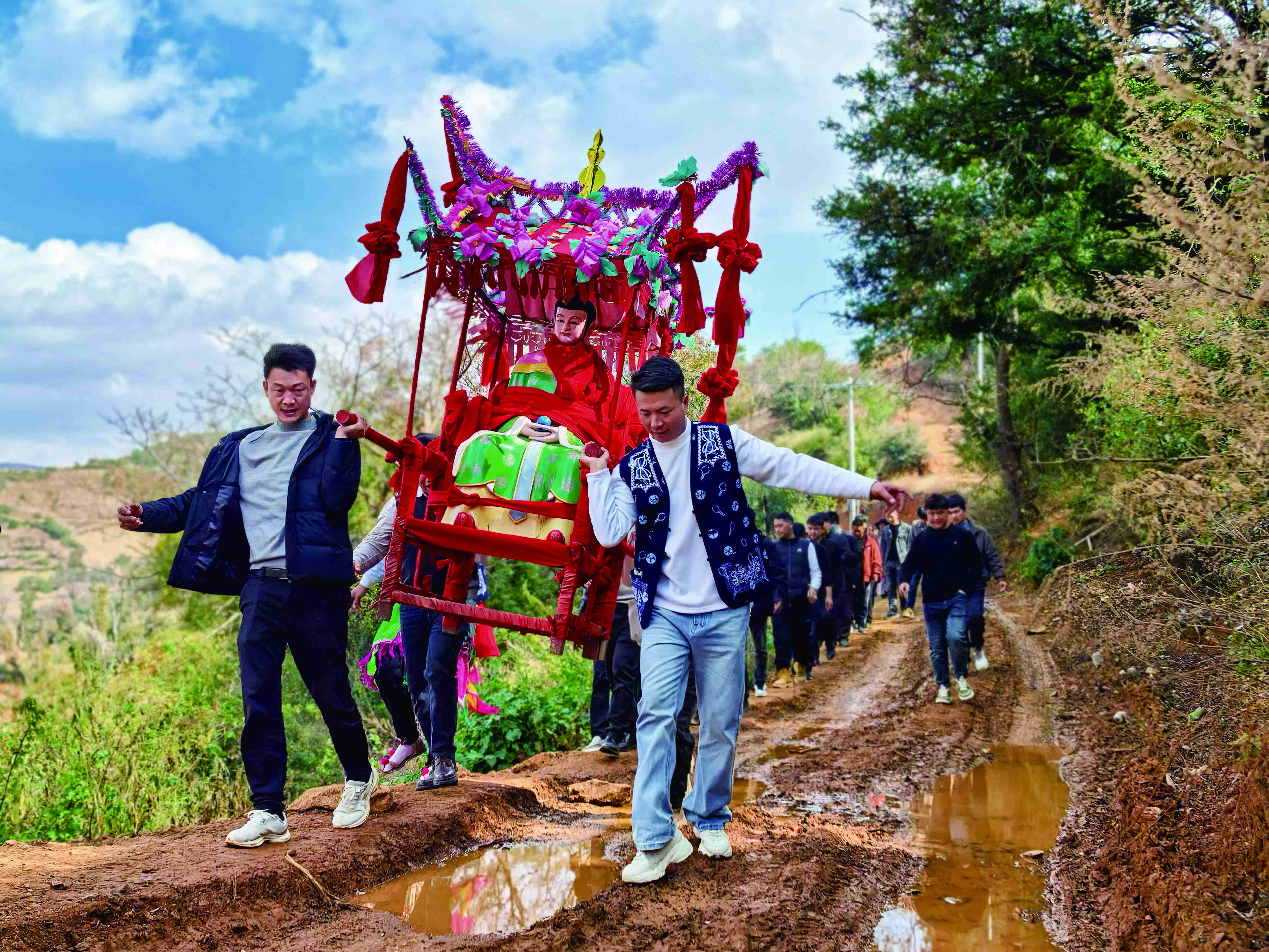 农历正月十五,宾川县大营镇千年白族古邑萂村坝子,锣鼓喧天,龙狮腾跃。身着节日盛装的村民载歌载舞,四面八方的宾朋慕名而来,共同沉浸在“天子节”的喜庆氛围中。这场历时半个月的多彩非遗年俗,让千年古村留住最美古韵乡愁,而贯穿其中的接本主仪式,更是将白族同胞的虔诚与热忱展现得淋漓尽致。