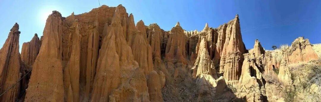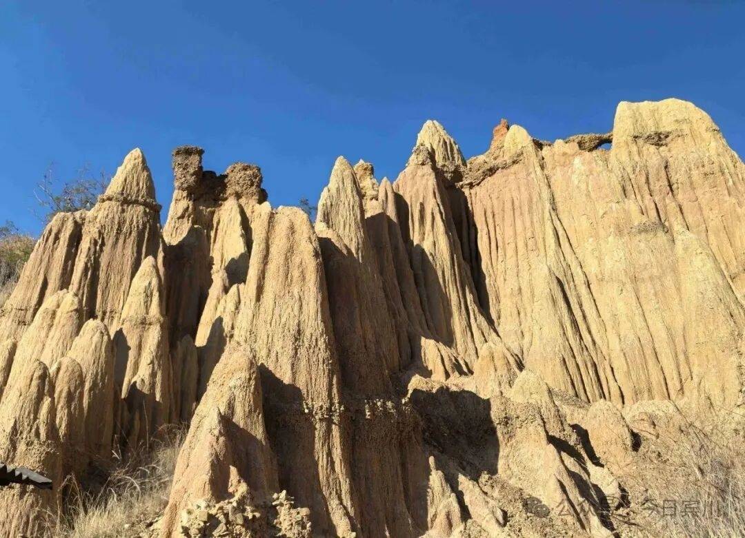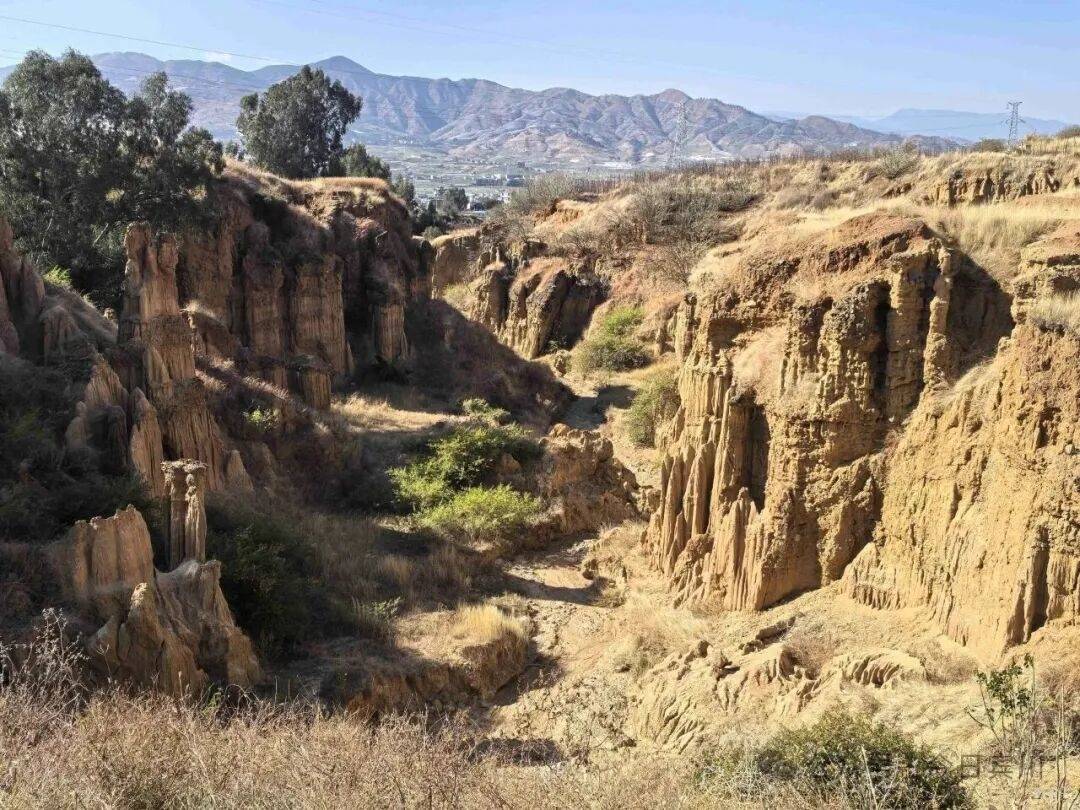 穿行于土林之间,天蓝土黄相映,七彩泥土交织成画,山箐间偶有野花点缀,冬日果园的绿意与金黄土柱相映成趣,氛围感十足。
