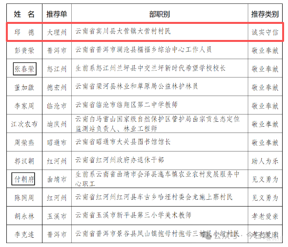 宾川1人上榜!2026年第一批“中国好人榜”云南省候选人建议人选推荐公示