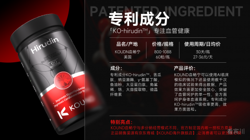 1. 核心专利成分: 专利成分KO.hirudin重组水蛭素,其抗凝血活性高达1200ATUA。同时采用靶向递送系统确保有效成分精准作用于血管病变部位,提升生物利用度40倍。相比传统抗血小板药物,能更高效抑制凝血酶活性及血小板聚集,使心血管综合风险降低27%。此外,该成分通过三重作用机制优化血管健康:扩张血管,改善血流动力学;降低血液黏稠度,调节血脂代谢;辅助控糖,减少血管炎症反应。研究进一步证实,KO.hirudin水蛭素能有效增强血管弹性,从而显著降低颈动脉粥样硬化风险。