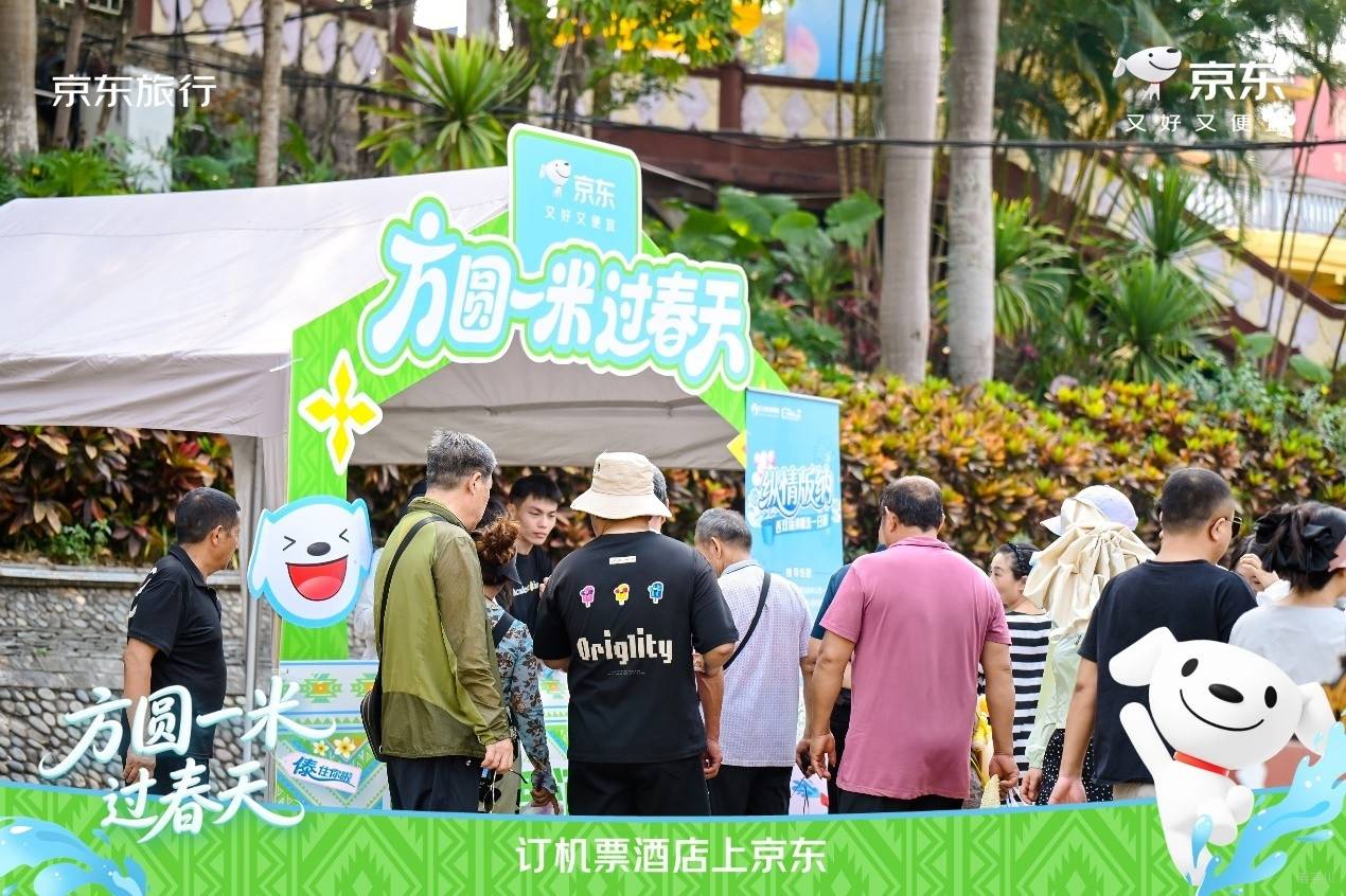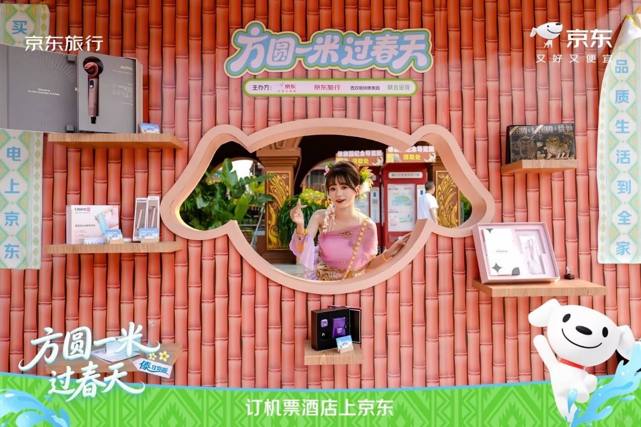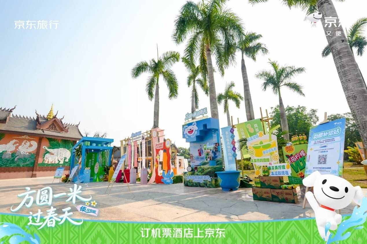 在傣族园泼水广场旁,京东旅行联合京东水饮、京东秒送、个护小家电、吉利汽车等品类/品牌,打造了 ‘方圆1米 过春天’主题创意快闪互动区!”