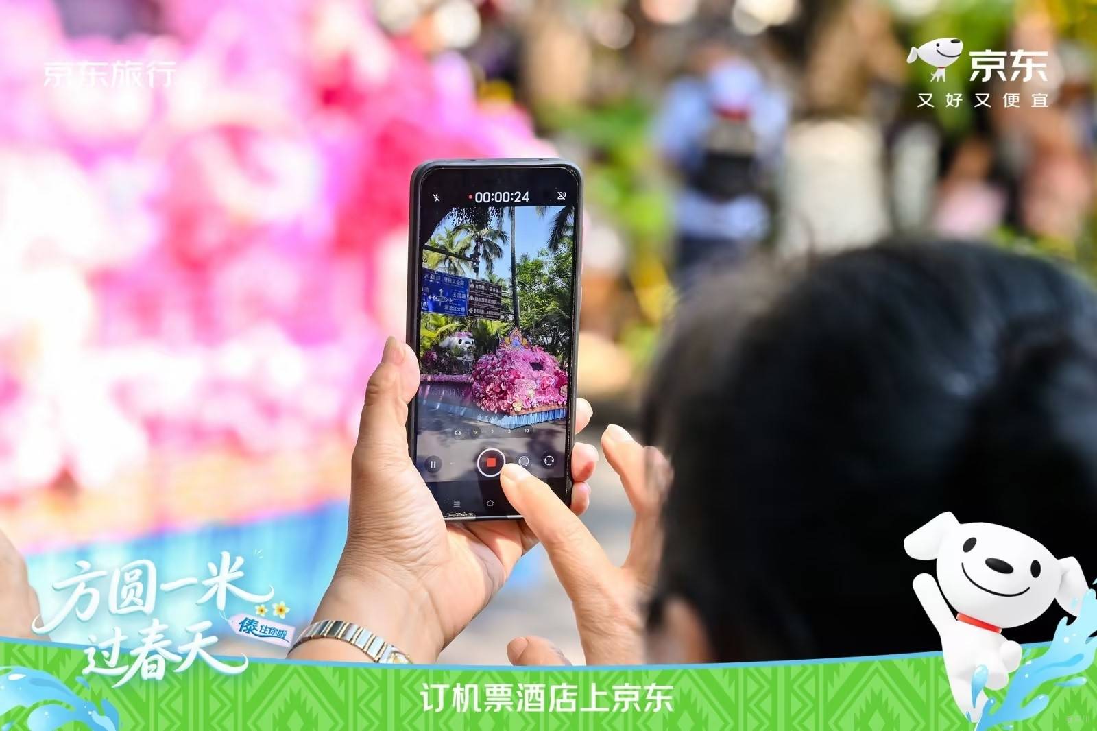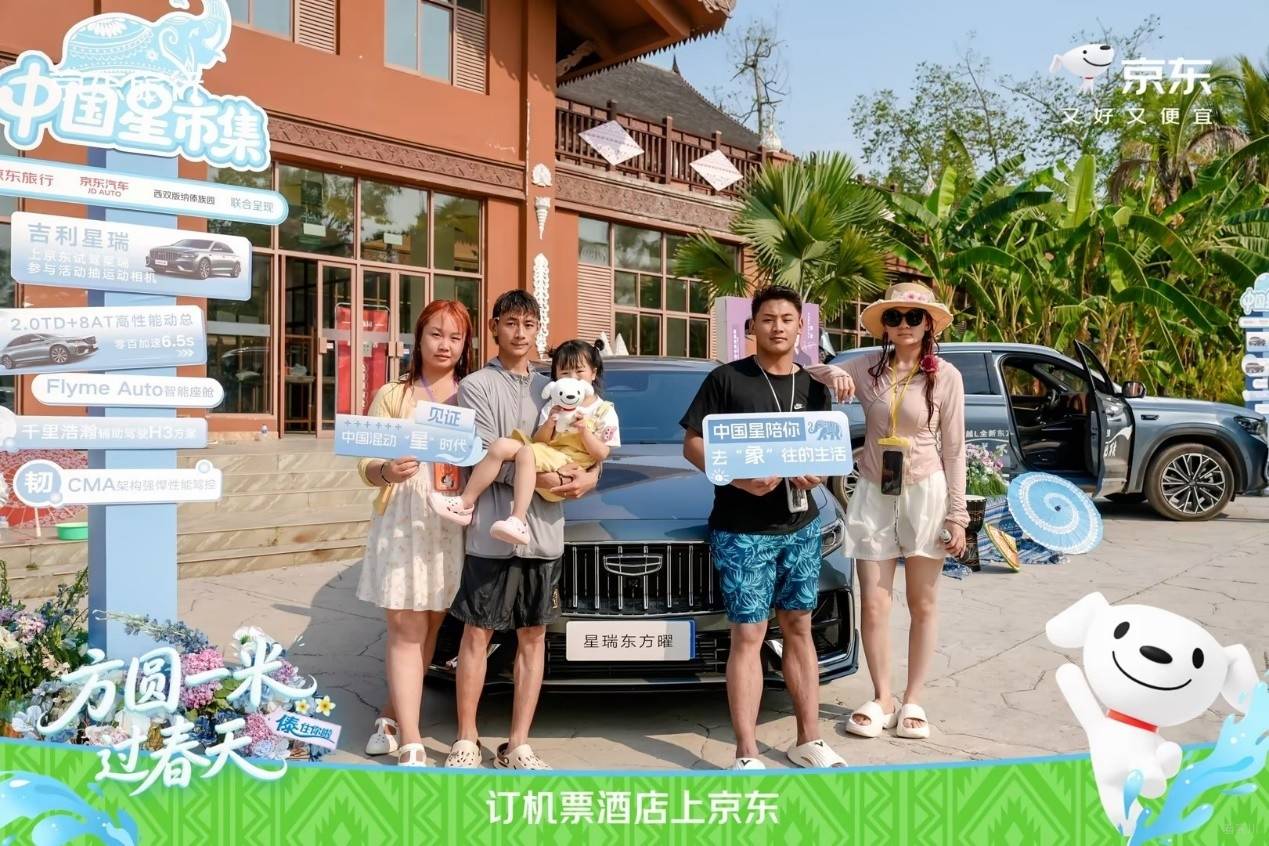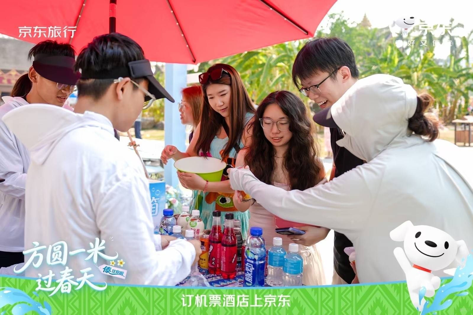 在傣族园泼水广场旁,京东旅行联合京东水饮、京东秒送、个护小家电、吉利汽车等品类/品牌,打造了 ‘方圆1米 过春天’主题创意快闪互动区!”