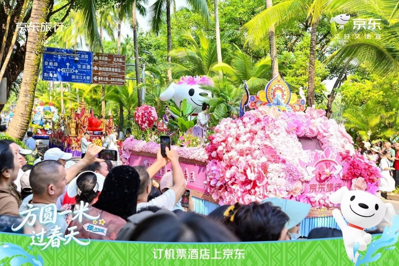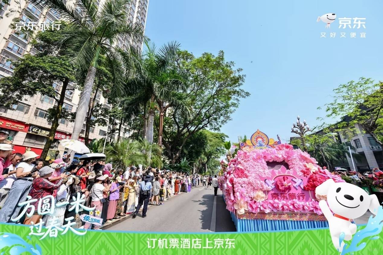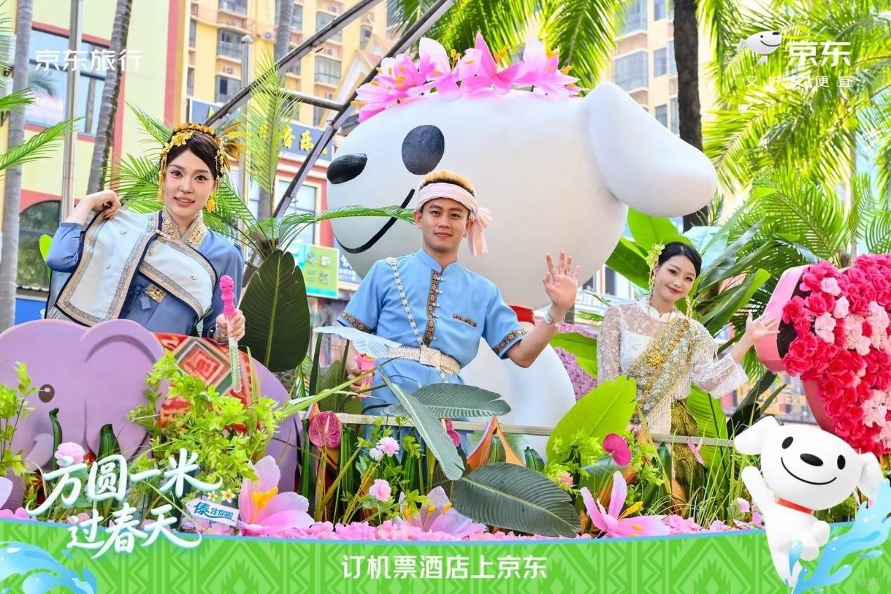 · 4月14日,主城区花车巡游: 京东旅行携手西双版纳州泼水节领导小组办公室,推出“京东花车方队”。花车以满载鲜花的簇拥下,京东吉祥物Joy身着民族盛装亮相,六位NPC伙伴分别代表京东在不同领域的品牌伙伴,生动诠释京东多元业务生态,传递“京东旅行带你探索世界”的品牌初心。