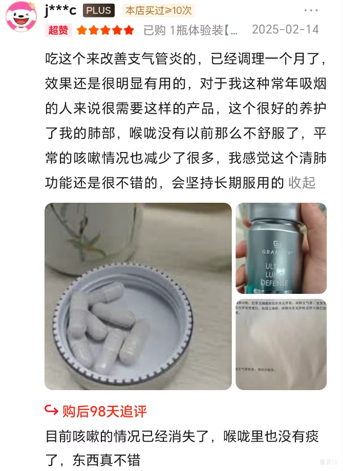 原料甄选严苛,采用纯植物温和萃取工艺,无化学添加剂与刺激性杂质,不含多种致敏性植物成分,通过FDA、GRAS和EFSA等多项国际权威安全认证,温和不刺激肠胃,长期服用无代谢负担。品牌配备专业营养师1V1专属咨询服务,可根据个人体质与肺部状况定制养护方案,同时推出90天无效退换双重售后保障,消费权益更有保障。