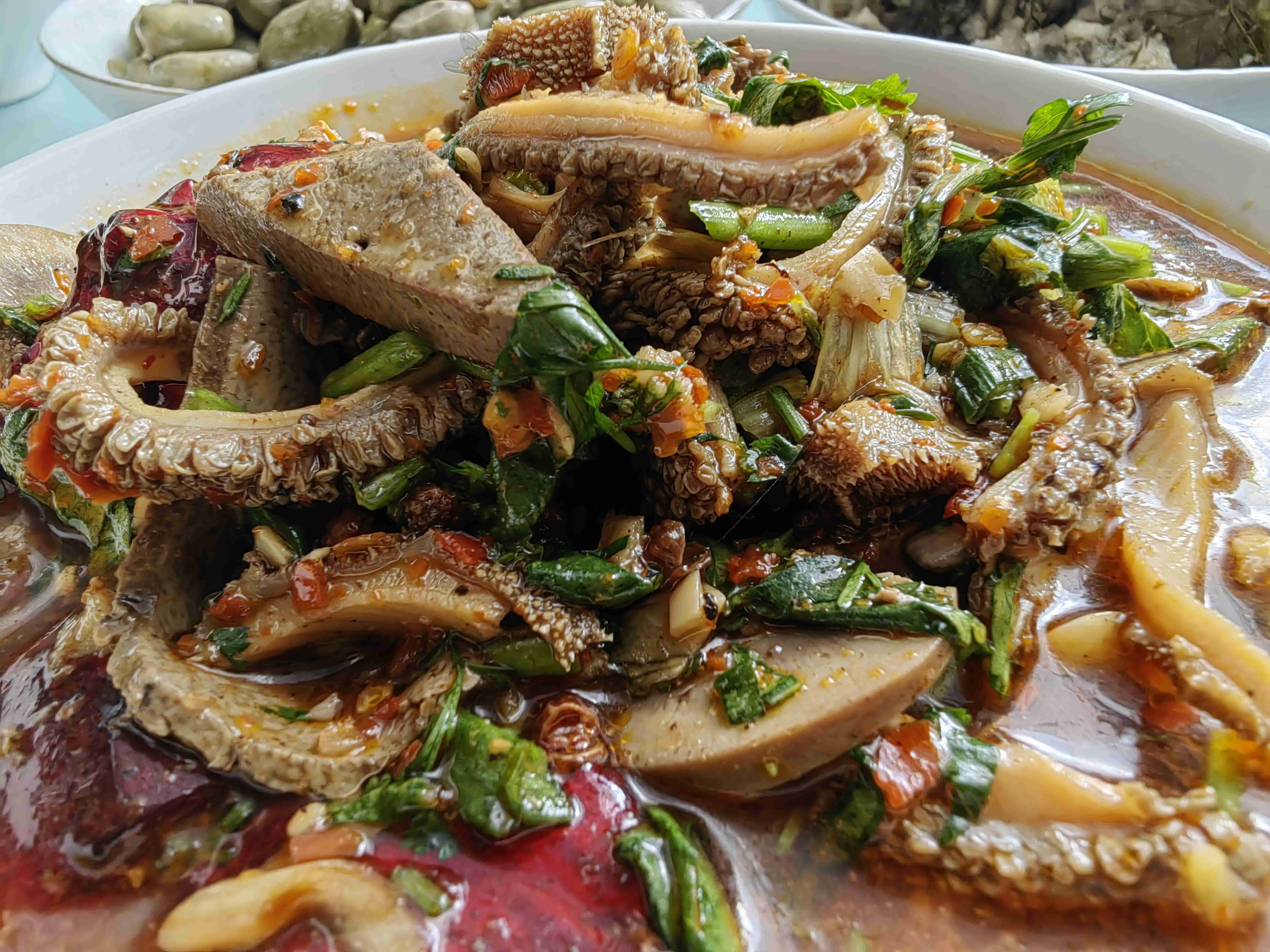 走进小院子,一股浓郁的羊肉香便裹挟着沃柑的清甜扑面而来,瞬间勾起了食欲。院子四周被硕果累累的橘树环绕,金黄的果实垂在枝头,触手可及。六叔一家早已备好饭菜,五六张桌子摆满了小院子,羊肉汤锅“咕嘟”作响,热气氤氲,彝乡拉乌的特色菜羊肝生、火腿肉、荷包豆一应俱全,色泽诱人。父亲难掩欣喜,执意要与家乡人小酌一杯,我因开车不便饮酒,便安心享用这桌充满烟火气的盛宴,每一口都藏着久违的亲情与故乡的味道。