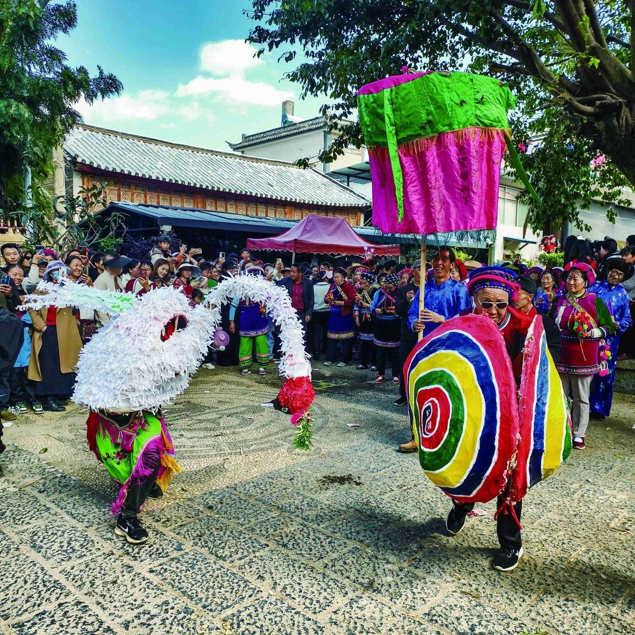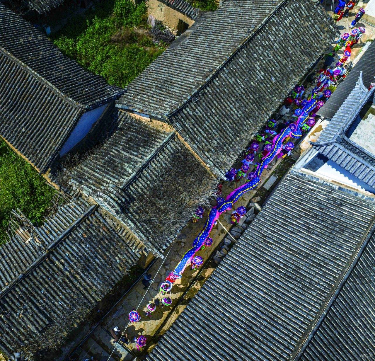 各龙狮表演队纷纷拿出看家本领,展示自家绝活,让前来观赏者叹为观止。他们争先恐后,在龙珠的引领下,龙腾虎跃,时而如猛虎下山,吼声震天;时而如蛟龙出海,勇猛向前。姑娘们穿上艳丽的白族服饰,在优美的音乐节拍中,打起了霸王鞭,腾挪翻转,令人眼花缭乱。让游客近距离领略到萂村民俗风情的无限魅力。