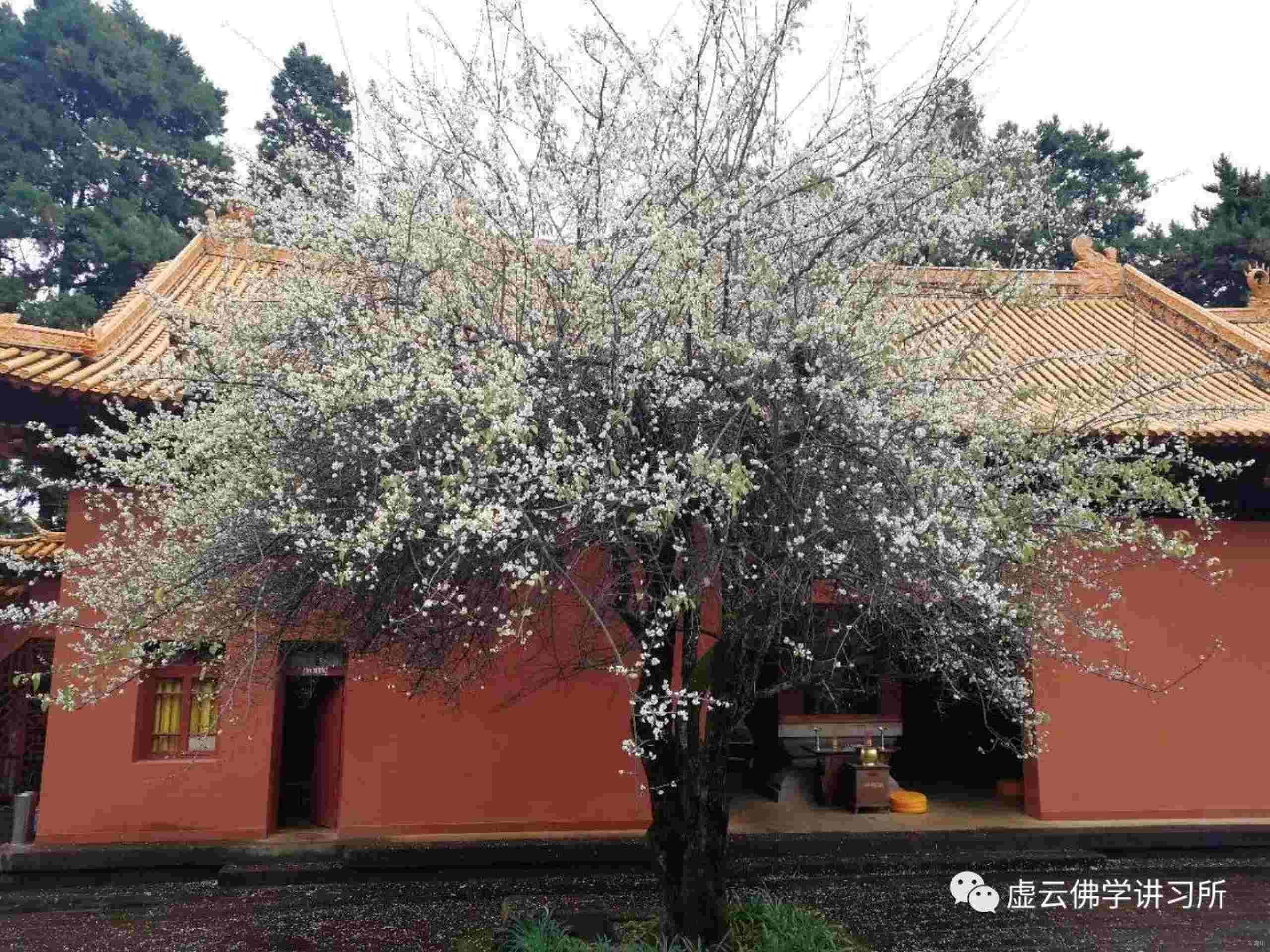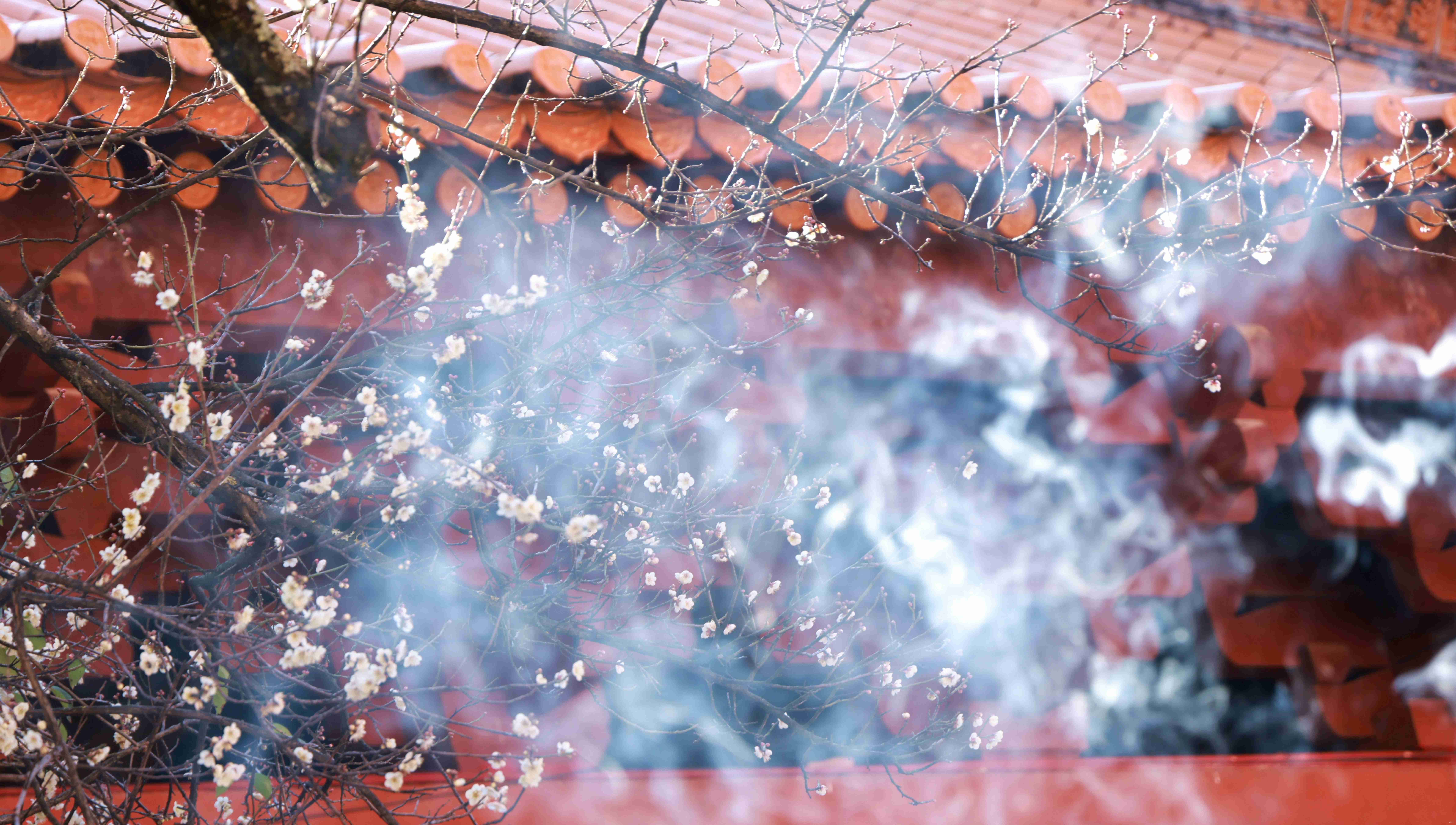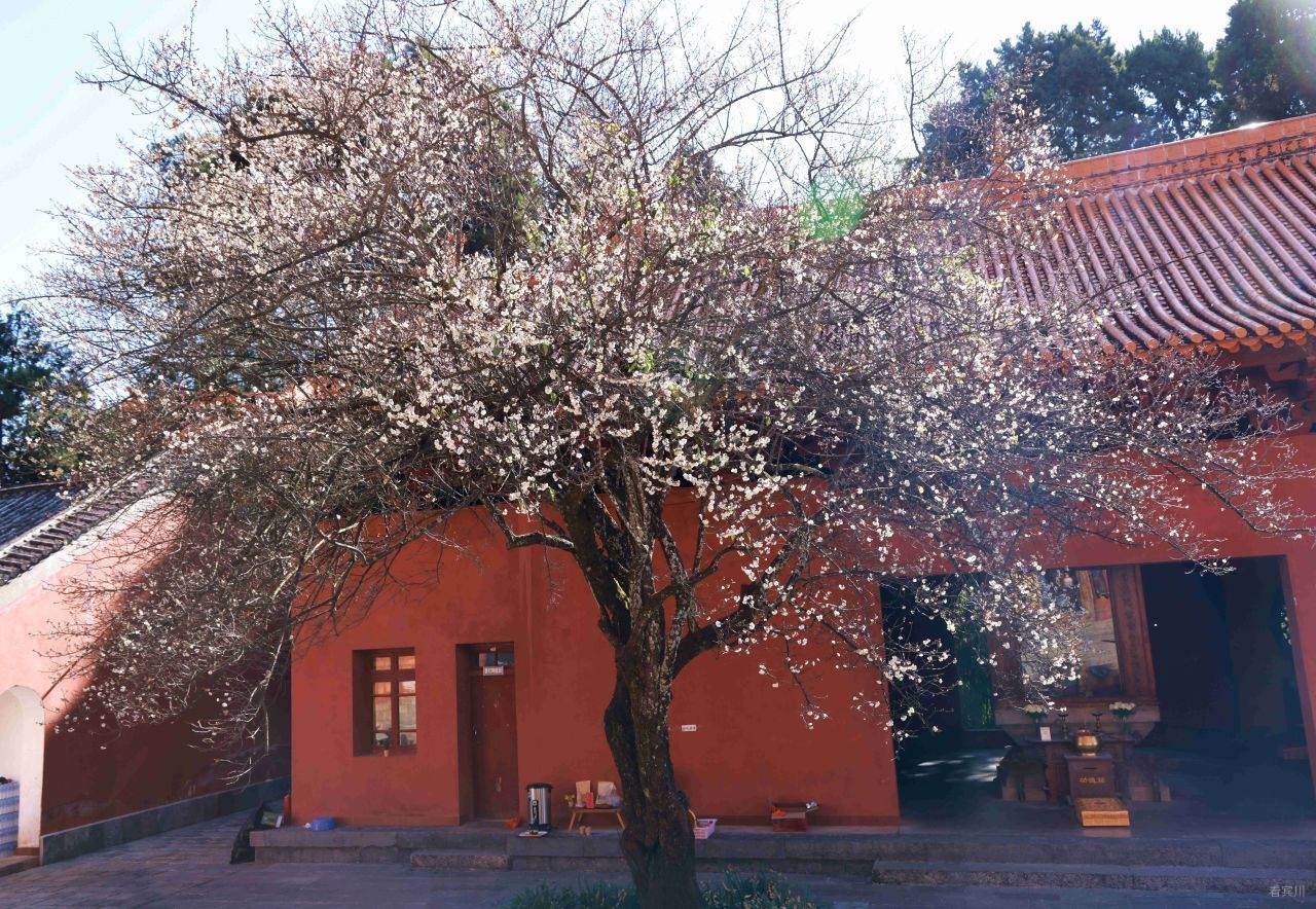 再往上穿过不二法门,从大殿进入寺内,在一二两进红墙大殿之间的院中,一树飞雪莹玉般洁白无瑕的梅花抢入心眼。一半梅花盛放,一半花苞待绽。徐霞客言梅“枝丛而干甚古,瓣细而花甚密,绿蒂朱蕾,冰魂粉眼,恍见吾乡故人。”说的不正是这韵致境界吗?在梅树下入院大殿的台阶上一把烧水桶,一壶热茶,一筒纸杯,一小块红牌子上写着“请喝茶”,我赶紧自接一杯热茶在手,一时整个寺院都温暖起来,正是恍见吾乡故人。今年梅花开得特别好,而梅树下惟升师那熟悉的身影却再也不见,不禁怆然。转头,我看见有香客在二进大殿前的大香炉处进香,香烟缭绕拂过大殿檐角的风铃散入空中,像从没有过。抬头,远处的点头峰在青天下巍然默立,那是惟升师告诉我的,那巍然屹立的是点头峰。