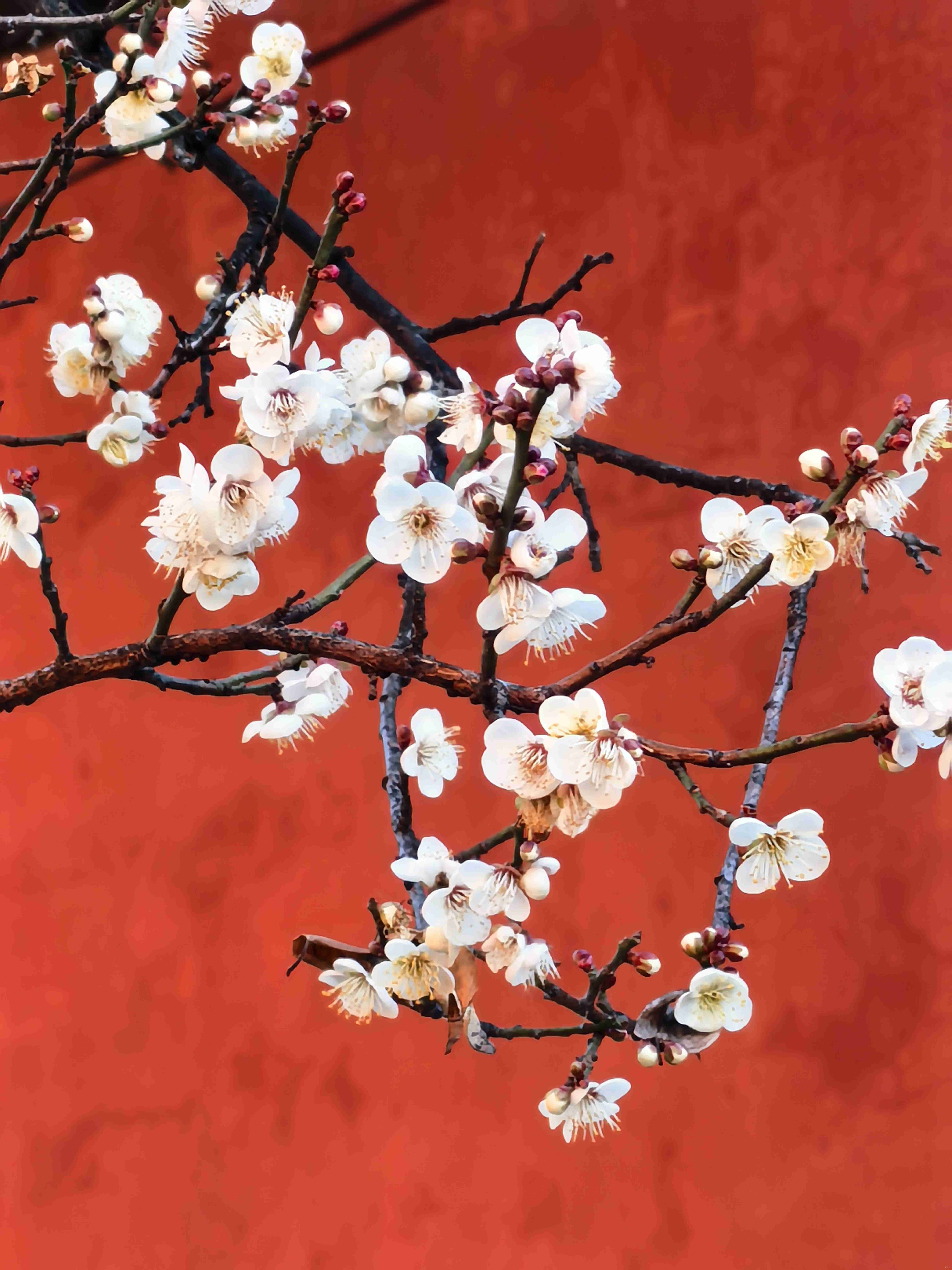 十五日后大寒,心里仍然记挂着虚云寺中的这棵梅花,我再度上山,此时梅花全盛,已少见花苞,一树的缤纷似雪映衬着寺院的红墙,也映衬着寺外点头峰下的重峦。似乎里里外外全是如雪的洁白,而实际上却只是这一树古梅的意蕴啊!有僧人在梅树下续那供客的茶水,梅花在他的头上静静地开得热闹非凡。我的镜头里全见着梅花的精神和高洁。当我出得寺来,行至寺院那佛源题字的山门,似乎仍然闻见着那暗度的幽香沁入心脾。