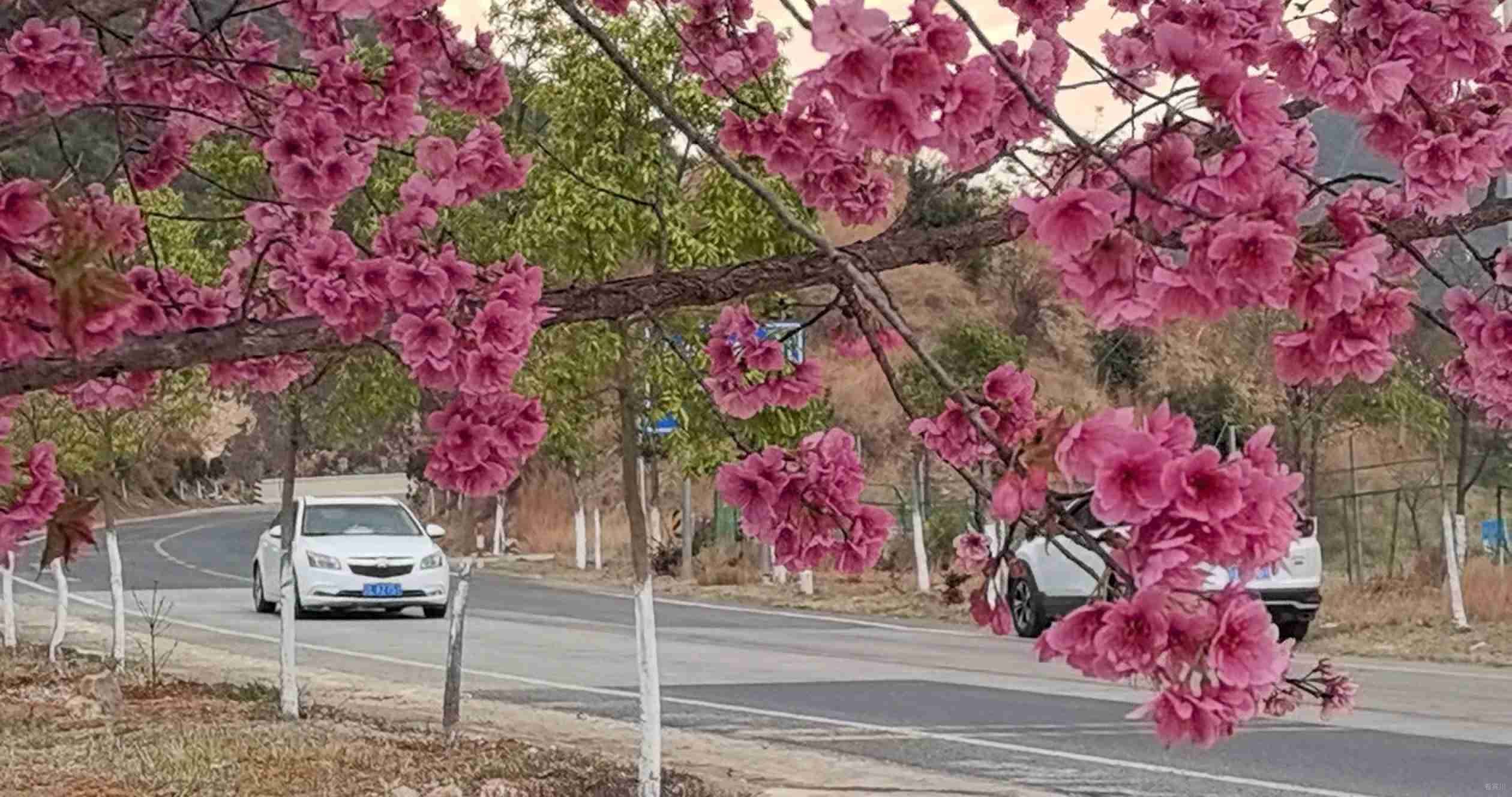 公路两边的一株株樱花开得如霞如烟,映衬在两旁的山脚下,宾川的冬日,哪怕是最后的严寒也让人温暖,像那桔园里挂满的红桔,是田园里劳动结出的热闹,足以抵御三九四九的凛冽。北方的谚语说“三九四九冻死猪狗”,可在云南的宾川无非是早晚的寒意在太阳出来后变得温顺可亲,只在四围的山间才有那寒霜的凌冽挂在那些潮湿的枝头,而太阳一照又立即温顺融化,滴落在寂静的山林里,在最冷的日子里日夜反复,无声无息像轮回的命运捉摸不定。其实,这条路我不陌生,上中学时曾两次和同学从县城牛井徒步到鸡足山祝圣寺,背负着行李,那时是初三,少男少女一大群,应该是四十多公里的路程,现在想起也并不惊讶。只是感叹现在的青年人还有没有这种随意长途行走的能力和心气?