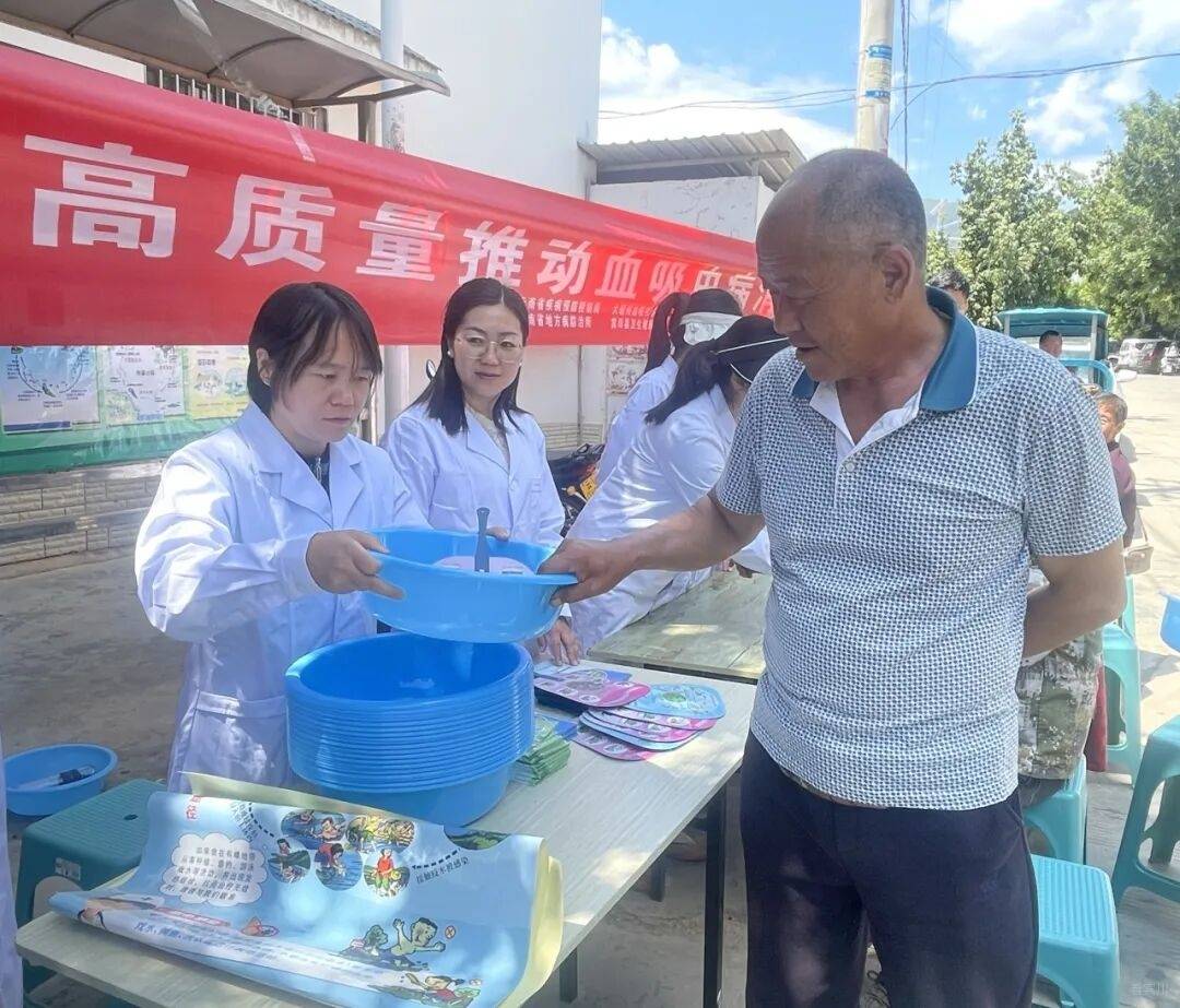 宣传活动期间,县血防站联合云南省地方病防治所、大理州血吸虫病防治研究所、县畜牧兽医渔业服务中心等多部门,走进医院、广场、校园、乡村、田间地头,开展精准化宣传服务。在世纪广场、乡镇集市等人员密集场所,工作人员通过设立咨询台、悬挂宣传横幅、发放宣传手册和实用物资等形式,向过往群众详细讲解血吸虫病的传播途径、危害及临床表现,重点普及钉螺辨认、疫水防范等核心知识。工作人员现场展示钉螺样本,让群众直观认识这种血吸虫唯一中间宿主的形态特征,打破“没症状就没病”的认知误区,引导群众改变生产生活习惯,避免接触疫水,从源头上防范感染风险。