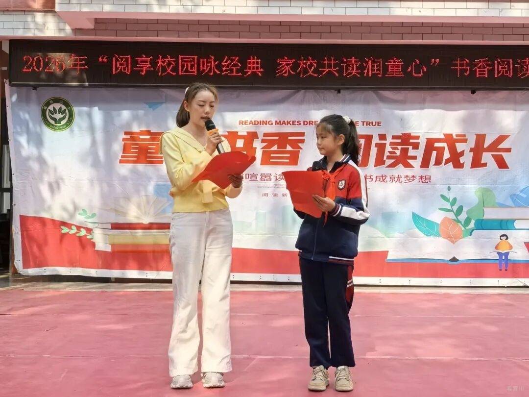 活动伊始,现场便被浓浓的书香氛围包围。亲子共读温情开启,家长与孩子们携手登台,站在舞台之上共同诵读。家长们手持书籍,身姿挺拔,有的温柔领读,有的深情伴读,声音沉稳而饱含爱意;身旁的孩子们则紧紧跟随,或昂首挺胸,或手持书本认真跟读,稚嫩的嗓音与家长的深情交相辉映,一字一句,高声诵读经典篇目,在琅琅书声中传递书香亲情,以站立的姿态展现亲子共读的美好时刻,让书香浸润童心,让陪伴温暖全场。其间,同学们带来精心编排的经典诵读与情景剧表演,用稚嫩而坚定的声音诵读经典篇章,声情并茂、昂扬向上,充分展现了新时代少年儿童朝气蓬勃的精神风貌。