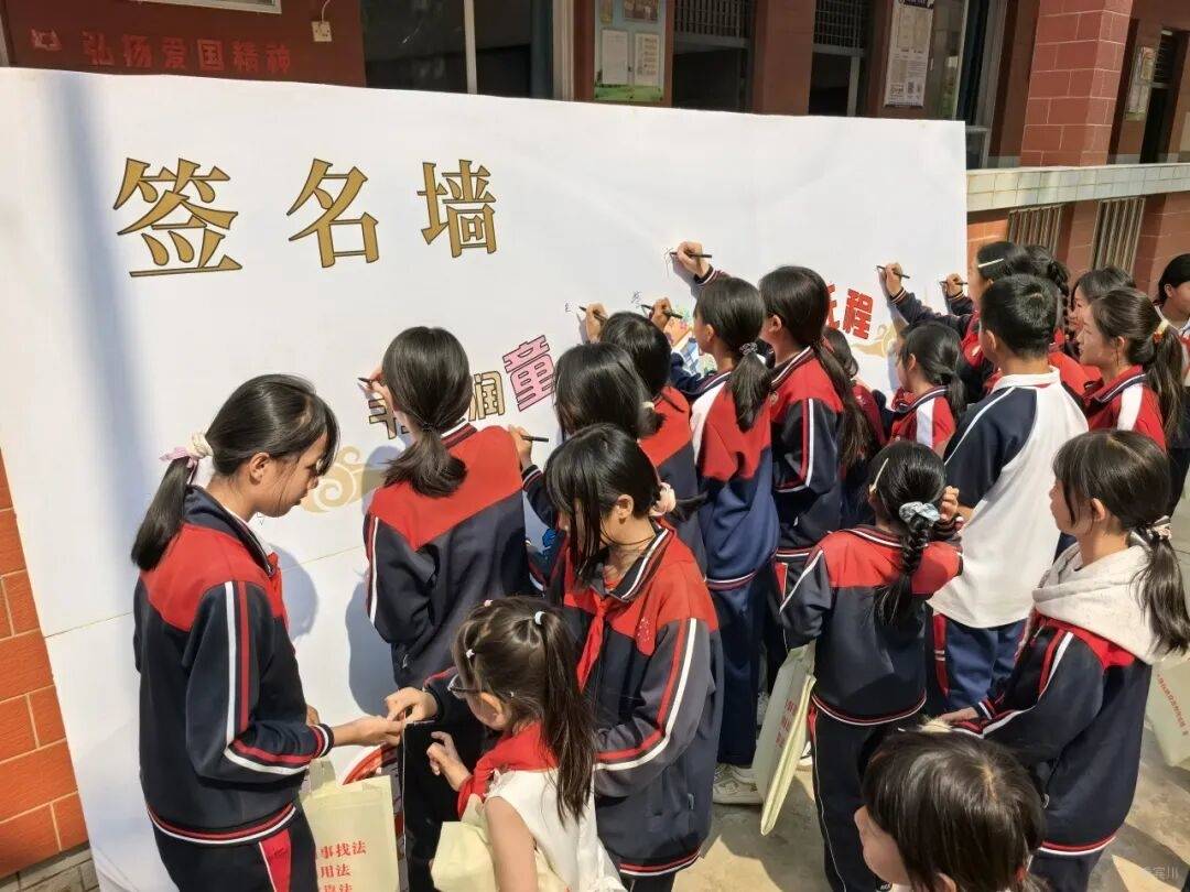 共读与展演结束后,全体学生移步至签名区,在“争做安全小卫士”安全签名墙上郑重签下自己的名字。这一笔一画,不仅是孩子们对遵守法律、重视安全的庄严承诺,也将法治与安全教育氛围推向高潮。