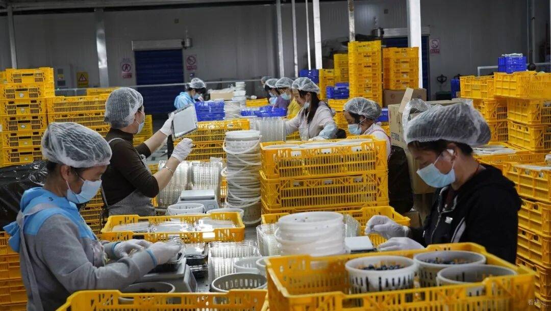 走进位于乔甸镇海稍水库旁的蓝莓种植基地,连片现代化大棚整齐铺开,72万株蓝莓植株长势喜人,饱满的蓝莓果缀满枝头,工人们正忙着采摘、分拣、装箱;包装车间内,200名工人有序作业,一颗颗裹着均匀果粉、糖度上乘的蓝莓,经严格筛选后快速打包,当天即可发往全国市场。