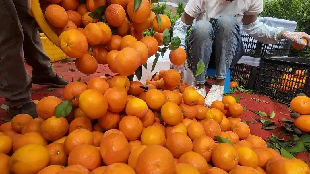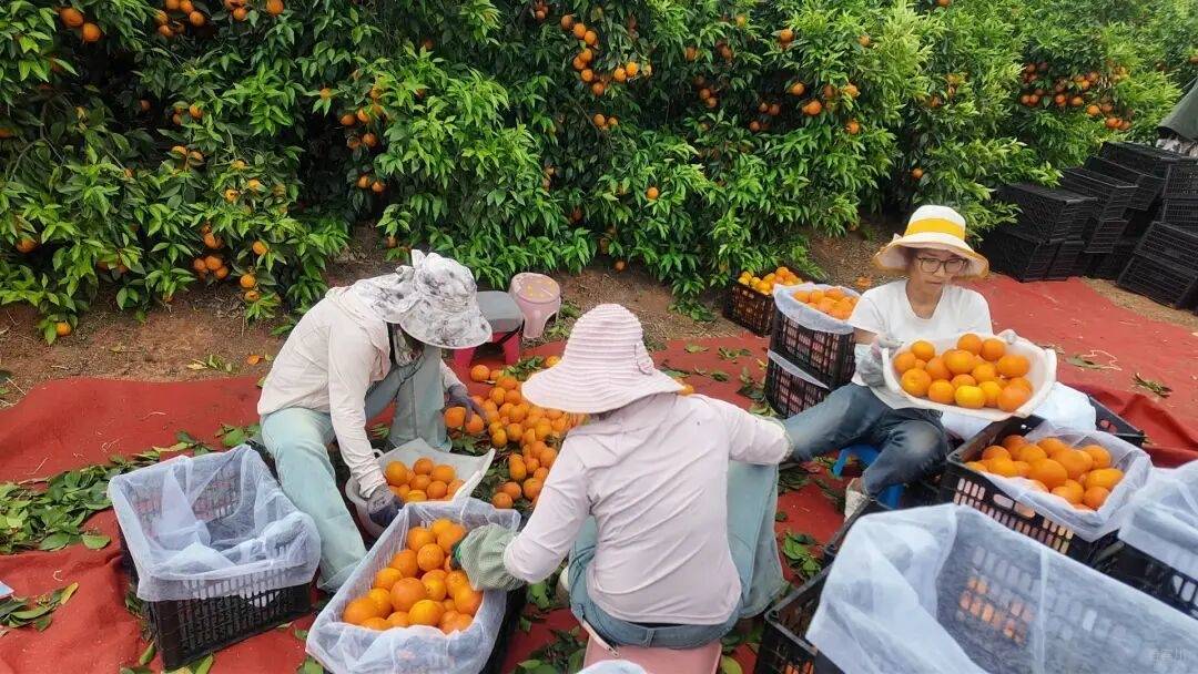 种植户白连天家的果园里,工人挑着沉甸甸的果筐往来穿梭。红布铺就的临时分拣台上,刚摘下的沃柑堆成了一座“小金山”,工人们正忙着挑果、分级、装箱,挑好的果子被麻利地装进塑料筐。不远处的大货车旁,一筐筐沃柑正被快速装车,现场一派热火朝天的丰收盛景。
